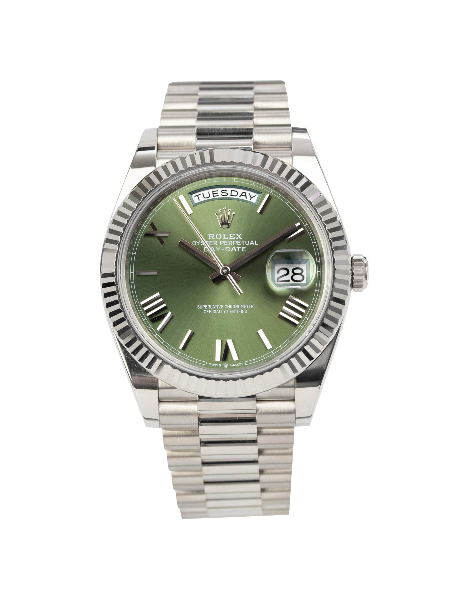 This Rolex Day-Date 40 228239 has a olive green roman numeral dial and a bracelet strap. This Rolex has undergone a thorough inspection of water resistance, accuracy, functionality and condition to determine the level of reconditioning required to meet our strict standards. It has also been referenced against technical documents and manufacturer records where available to ensure authenticity and a clean history. Our watches have a 24-month warranty for your peace of mind, in conjunction with any remaining manufacturer’s warranty from new or from service. To maintain the manufacturer’s warranty on this watch, it has not been polished in our service centre.