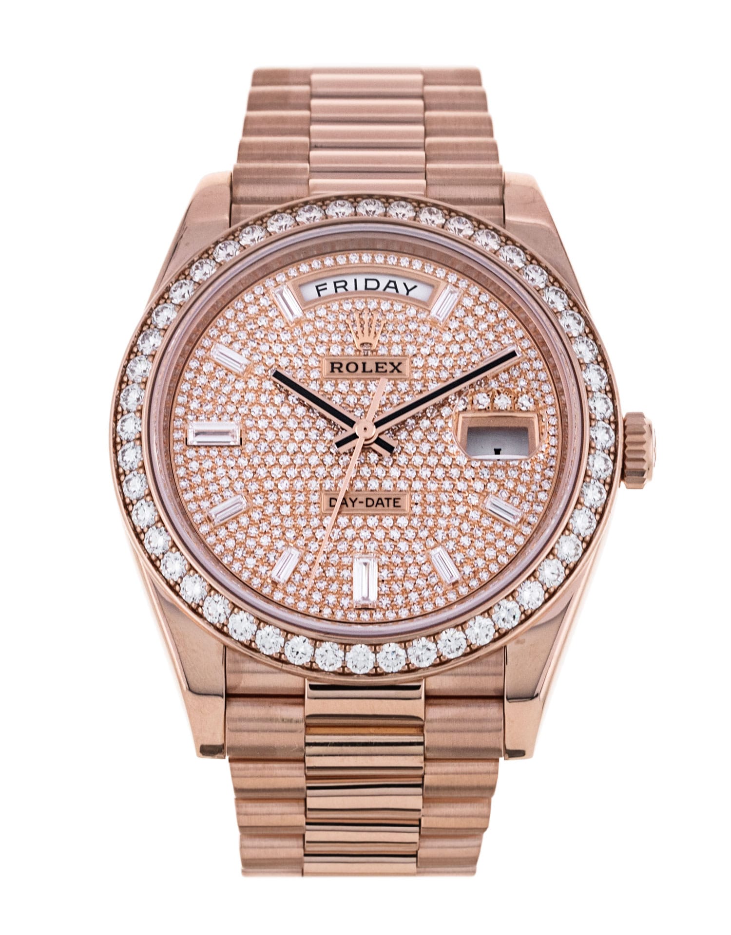 This Rolex Day-Date 40 228345 RBR has a diamond paved dial and a bracelet strap. This Rolex has undergone a thorough inspection of water resistance, accuracy, functionality and condition to determine the level of reconditioning required to meet our strict standards. It has also been referenced against technical documents and manufacturer records where available to ensure authenticity and a clean history. Our watches have a 24-month warranty for your peace of mind, in conjunction with any remaining manufacturer’s warranty from new or from service. To maintain the manufacturer’s warranty on this watch, it has not been polished in our service centre.