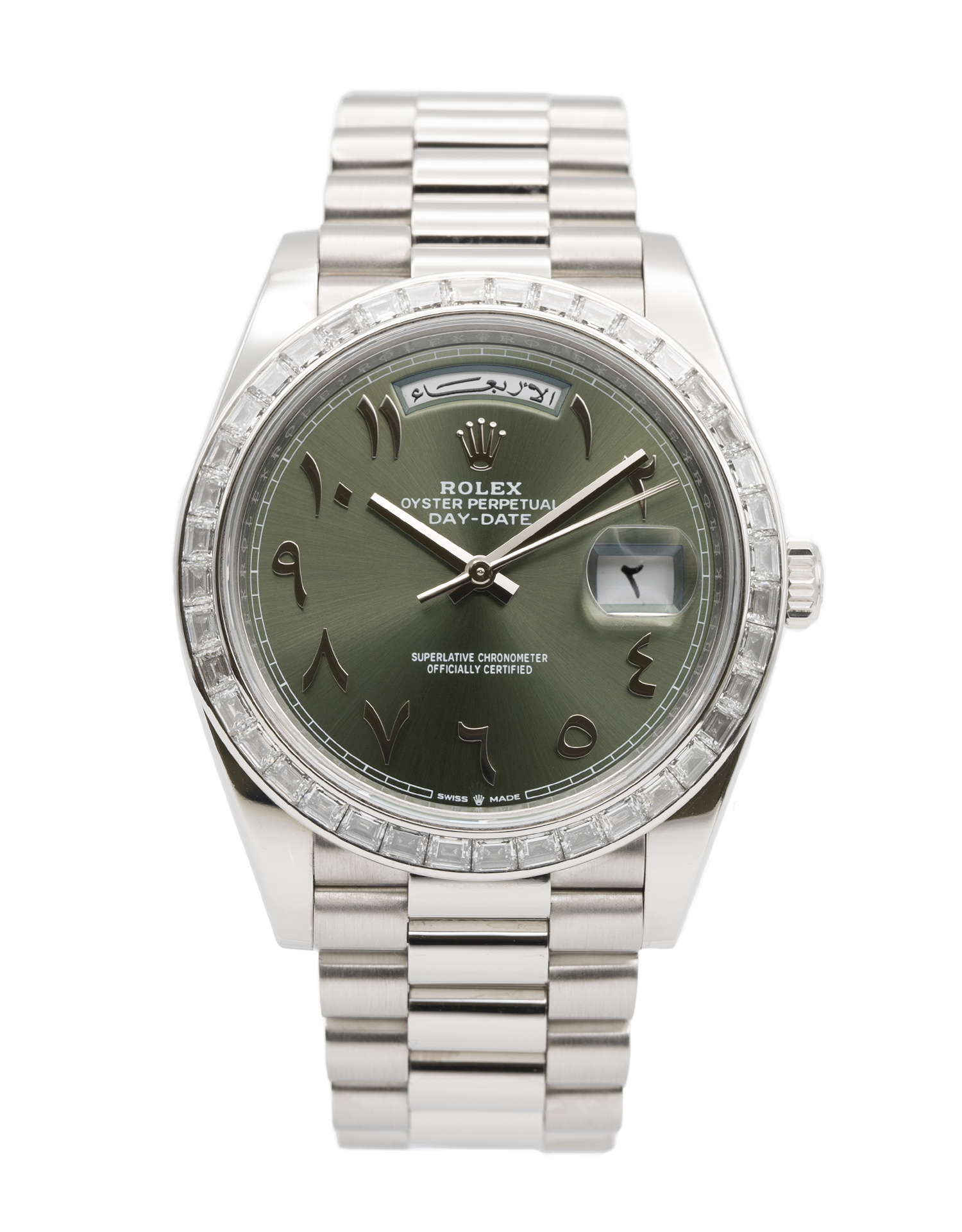 This Rolex Day-Date 40 228396 TBR has a olive green - hindu arabic dial and a bracelet strap. This Rolex has undergone a thorough inspection of water resistance, accuracy, functionality and condition to determine the level of reconditioning required to meet our strict standards. It has also been referenced against technical documents and manufacturer records where available to ensure authenticity and a clean history. Our watches have a 24-month warranty for your peace of mind, in conjunction with any remaining manufacturer’s warranty from new or from service. To maintain the manufacturer’s warranty on this watch, it has not been polished in our service centre.
