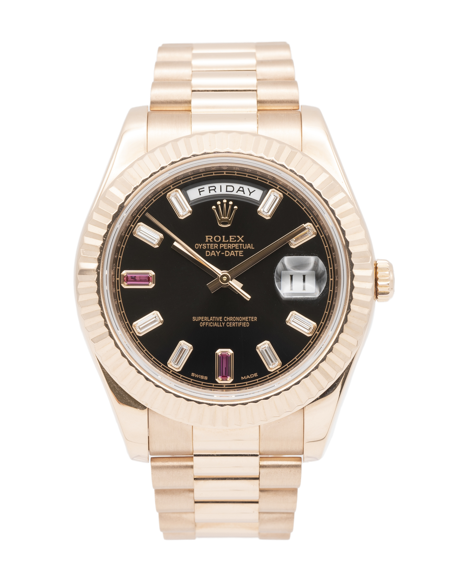 Originally introduced in 1956, the Day-Date was the first watch to indicate the day of the week spelt out in full when it was launched, making it an innovative piece. In 2008, Rolex released the Day-Date II, a modern update of the timelessly classic Day-Date, which features a larger case than the original watch. However, this has since been replaced by the Day-Date 40, introduced back in 2015. This Day-Date II, then, features a rose gold bracelet, fluted bezel and case, both effortlessly paired with the black baton dial that features baguette-cut diamond and ruby hour markers. This piece is perfect for those after a little bling, or with a taste for rare and discontinued Rolex models.