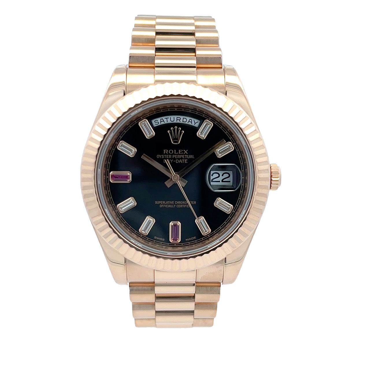 Originally introduced in 1956, the Day-Date was the first watch to indicate the day of the week spelt out in full when it was launched, making it an innovative piece. In 2008, Rolex released the Day-Date II, a modern update of the timelessly classic Day-Date, which features a larger case than the original watch. However, this has since been replaced by the Day-Date 40, introduced back in 2015. This Day-Date II, then, features a rose gold bracelet, fluted bezel and case, both effortlessly paired with the black baton dial that features baguette-cut diamond and ruby hour markers. This piece is perfect for those after a little bling, or with a taste for rare and discontinued Rolex models.