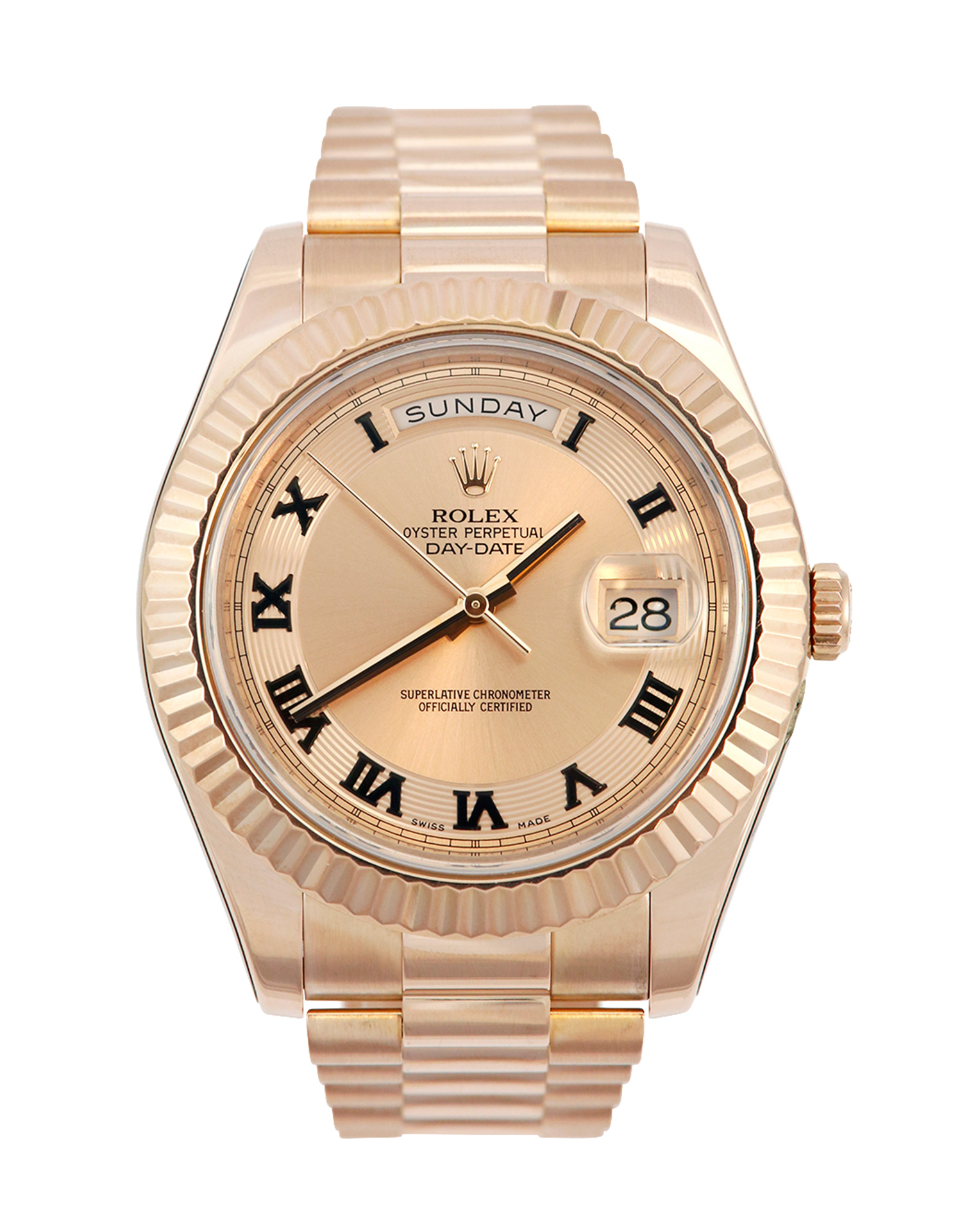 This Rolex Day-Date II 218235 has a rose roman numeral dial and a bracelet strap. This Rolex has undergone a thorough inspection of water resistance, accuracy, functionality and condition to determine the level of reconditioning required to meet our strict standards. It has also been referenced against technical documents and manufacturer records where available to ensure authenticity and a clean history. All our watches have a 24-month warranty for your peace of mind. One of our skilled polishing technicians has removed marks on the case and bracelet of this watch, brought about by daily wear and tear, which is why this watch does not come with the remaining manufacturer’s warranty.