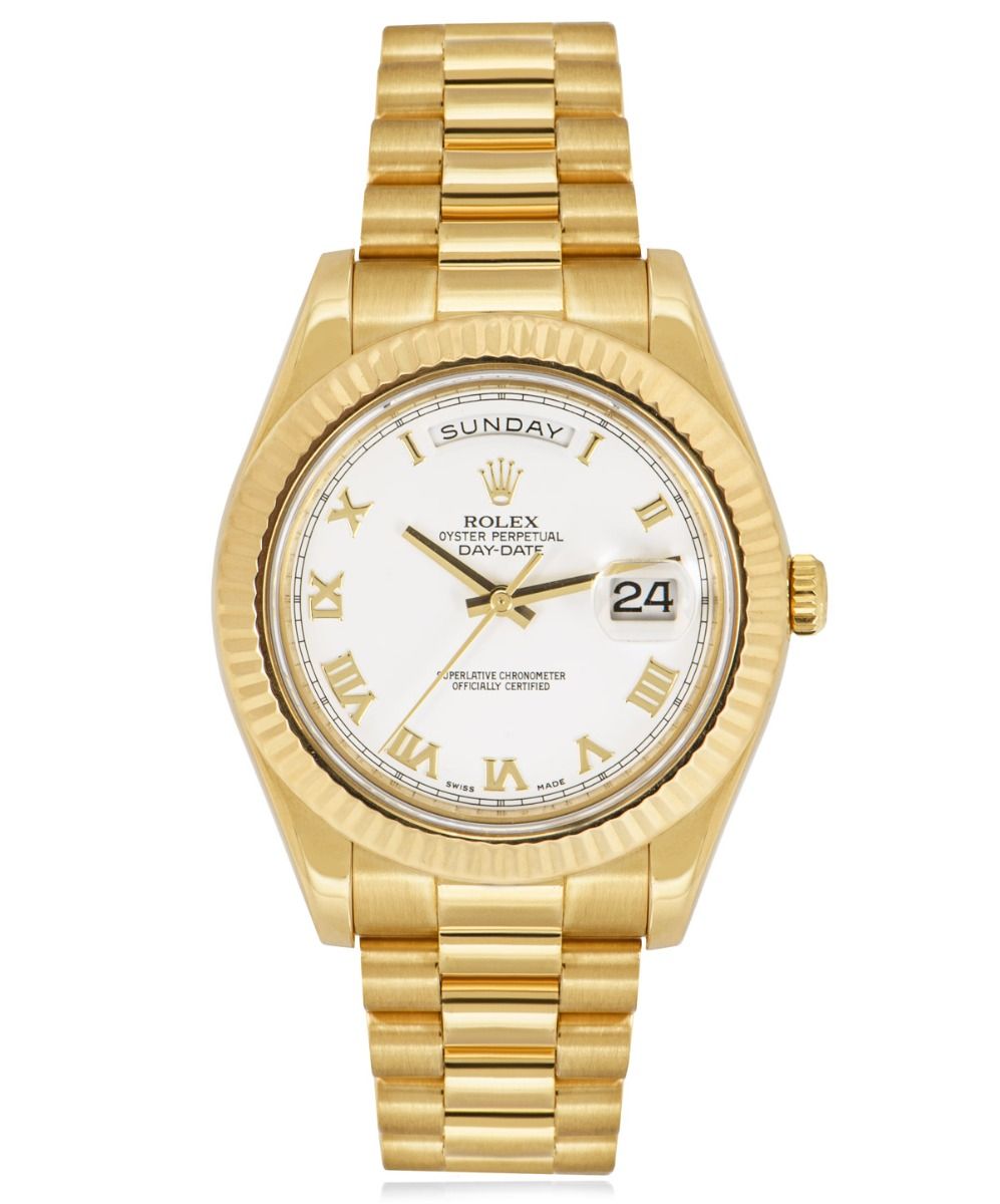 This Rolex Day-Date II 218238 has a white roman numeral dial and a bracelet strap. This Rolex has undergone a thorough inspection of water resistance, accuracy, functionality and condition to determine the level of reconditioning required to meet our strict standards. It has also been referenced against technical documents and manufacturer records where available to ensure authenticity and a clean history. All our watches have a 24-month warranty for your peace of mind. One of our skilled polishing technicians has removed marks on the case and bracelet of this watch, brought about by daily wear and tear, which is why this watch does not come with the remaining manufacturer’s warranty.