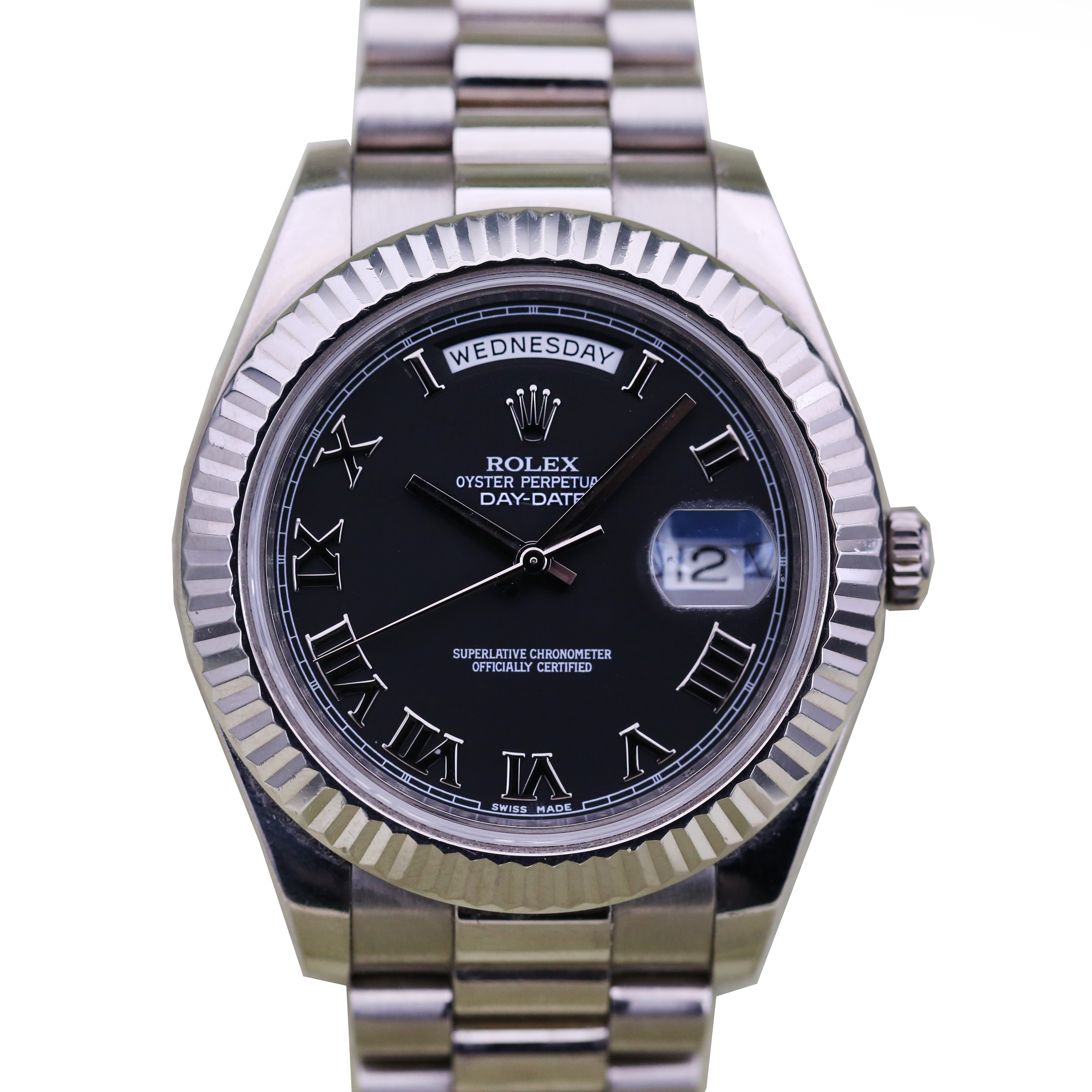 This Rolex Day-Date II 218239 has a blue roman numeral dial and a bracelet strap. This Rolex has undergone a thorough inspection of water resistance, accuracy, functionality and condition to determine the level of reconditioning required to meet our strict standards. It has also been referenced against technical documents and manufacturer records where available to ensure authenticity and a clean history. All our watches have a 24-month warranty for your peace of mind. One of our skilled polishing technicians has removed marks on the case and bracelet of this watch, brought about by daily wear and tear, which is why this watch does not come with the remaining manufacturer’s warranty.