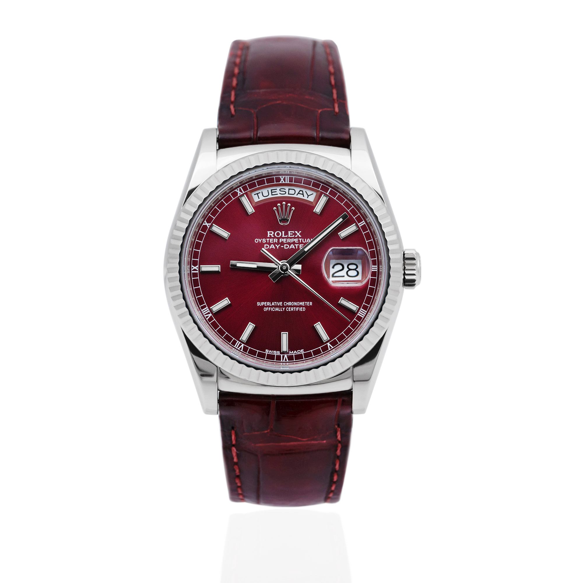This Rolex Day-Date 118139 has a cherry baton dial and a leather strap. This Rolex has undergone a thorough inspection of water resistance, accuracy, functionality and condition to determine the level of reconditioning required to meet our strict standards. It has also been referenced against technical documents and manufacturer records where available to ensure authenticity and a clean history. All our watches have a 24-month warranty for your peace of mind. One of our skilled polishing technicians has removed marks on the case and bracelet of this watch, brought about by daily wear and tear, which is why this watch does not come with the remaining manufacturer’s warranty.