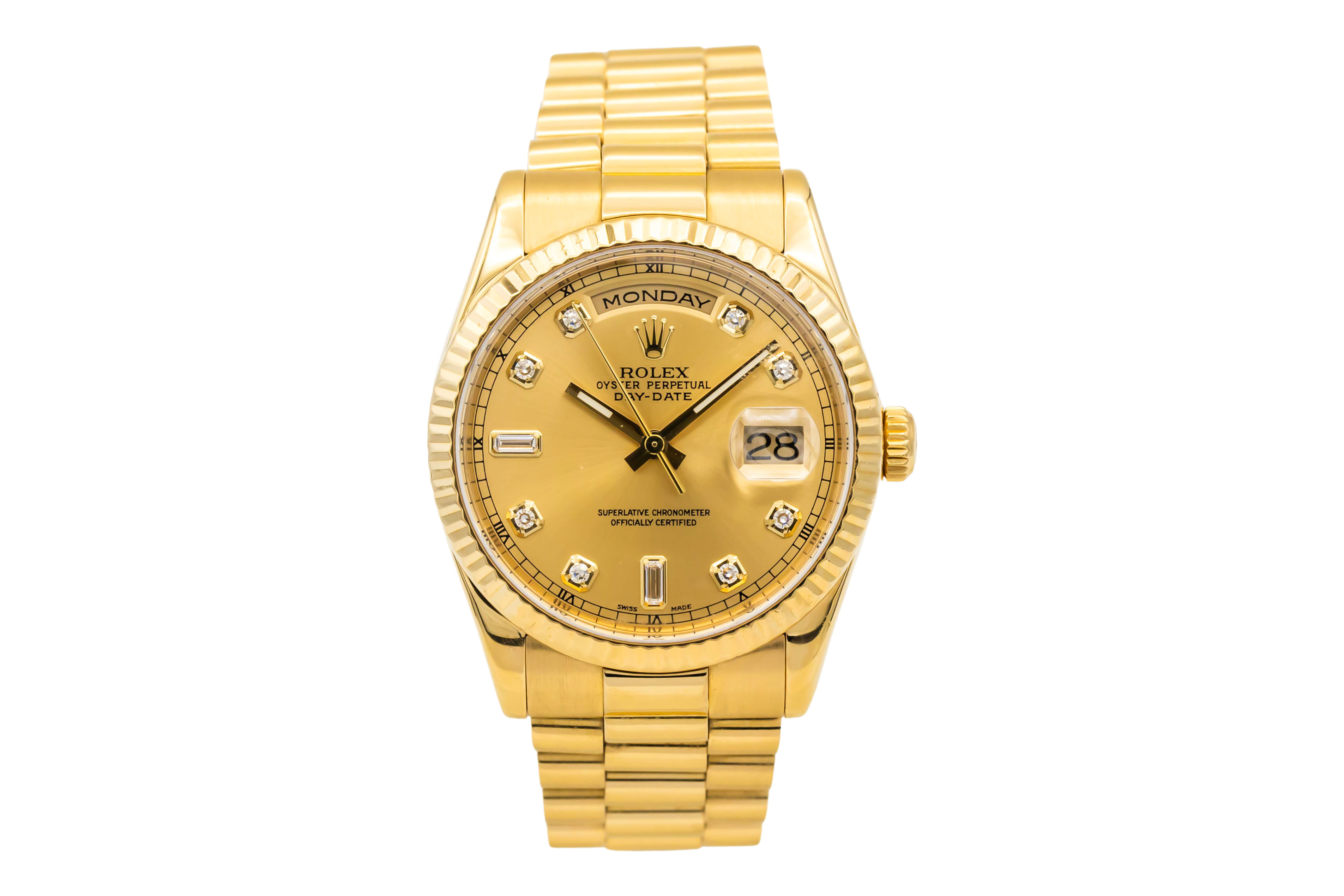 One of Rolex's most prestigious collections, the Day-Date originated in 1956 and earned its name from a special new movement that showed not just the date (at 3 o'clock) but also the day of the week in a regal-looking window at 12. The watch is known for its 'President' bracelet with concealed clasp, although the watch as a whole is often referred to as the President's watch because many US Presidents, as well as other accomplished world leaders like Winston Churchill, are known to have worn it. The watch was among the first to be officially labeled 'Superlative Chronometer Officially Certified' on the dial. This particularly splendid reference is known for is superb golden case and bracelet.