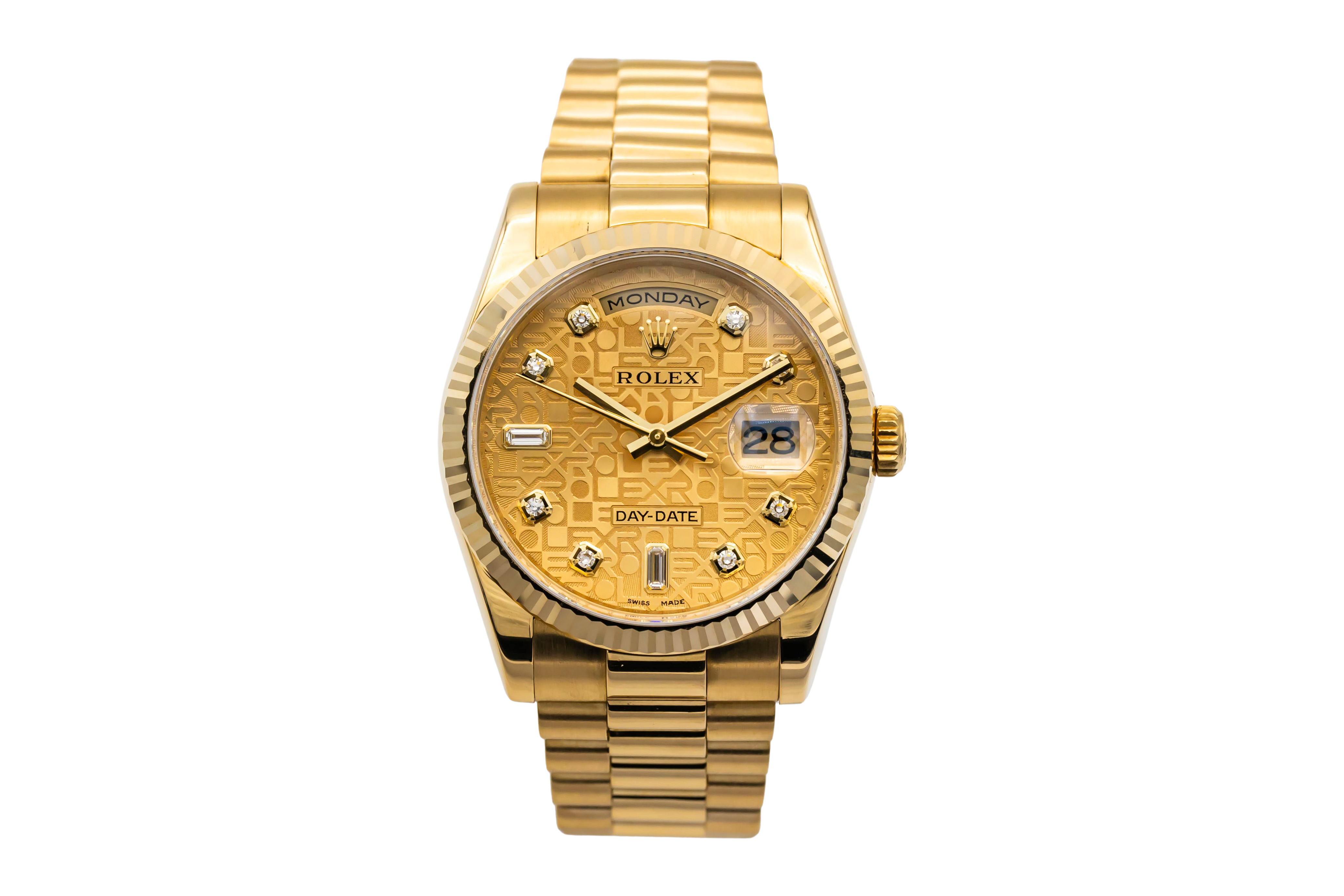This Rolex Day-Date 118238 has a champagne jubilee diamond dial and a bracelet strap. This Rolex has undergone a thorough inspection of water resistance, accuracy, functionality and condition to determine the level of reconditioning required to meet our strict standards. It has also been referenced against technical documents and manufacturer records where available to ensure authenticity and a clean history. All our watches have a 24-month warranty for your peace of mind. One of our skilled polishing technicians has removed marks on the case and bracelet of this watch, brought about by daily wear and tear, which is why this watch does not come with the remaining manufacturer’s warranty.