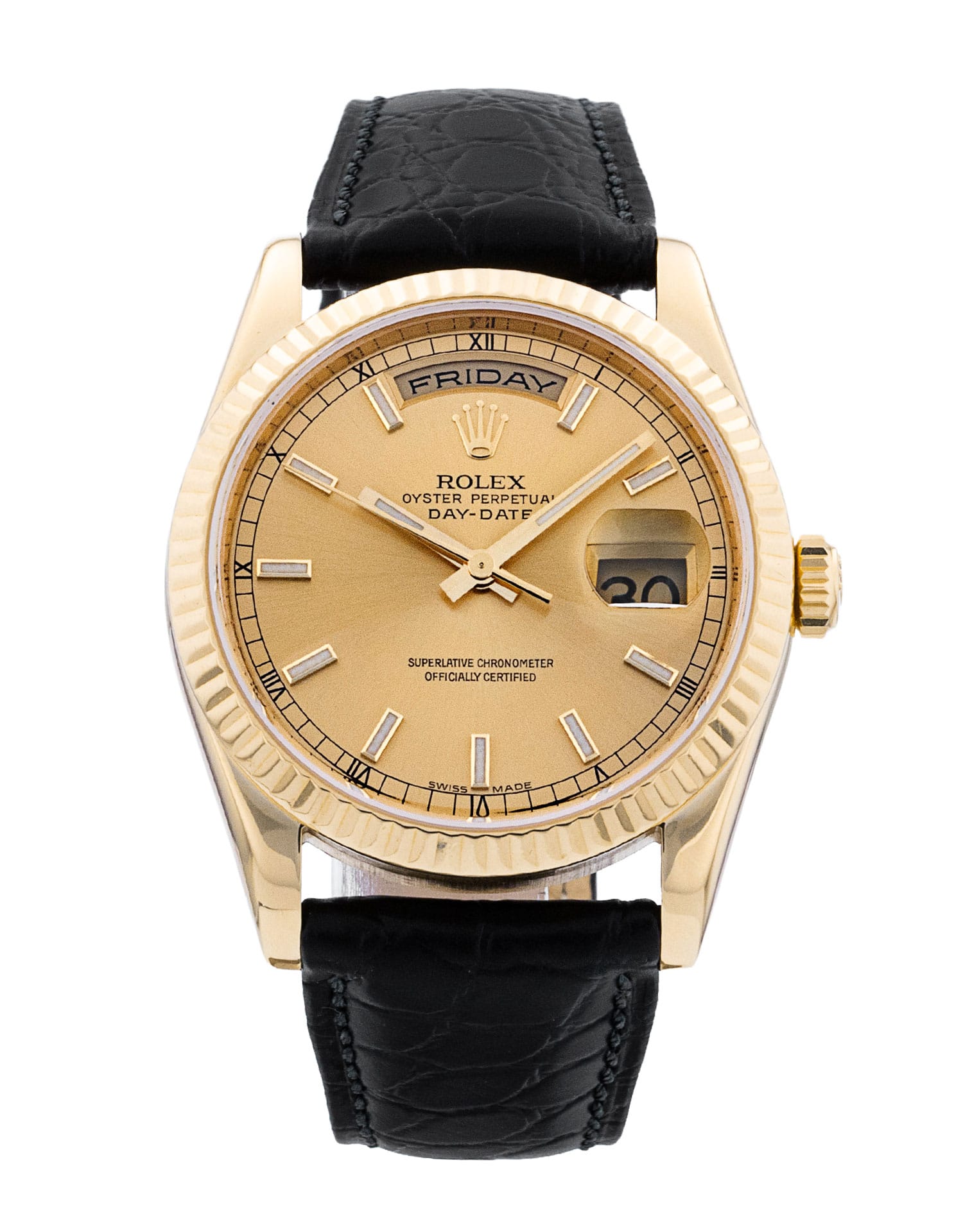 This Rolex Day-Date 118238 has a champagne baton dial and a leather strap. This Rolex has undergone a thorough inspection of water resistance, accuracy, functionality and condition to determine the level of reconditioning required to meet our strict standards. It has also been referenced against technical documents and manufacturer records where available to ensure authenticity and a clean history. Our watches have a 24-month warranty for your peace of mind, in conjunction with any remaining manufacturer’s warranty from new or from service. To maintain the manufacturer’s warranty on this watch, it has not been polished in our service centre.