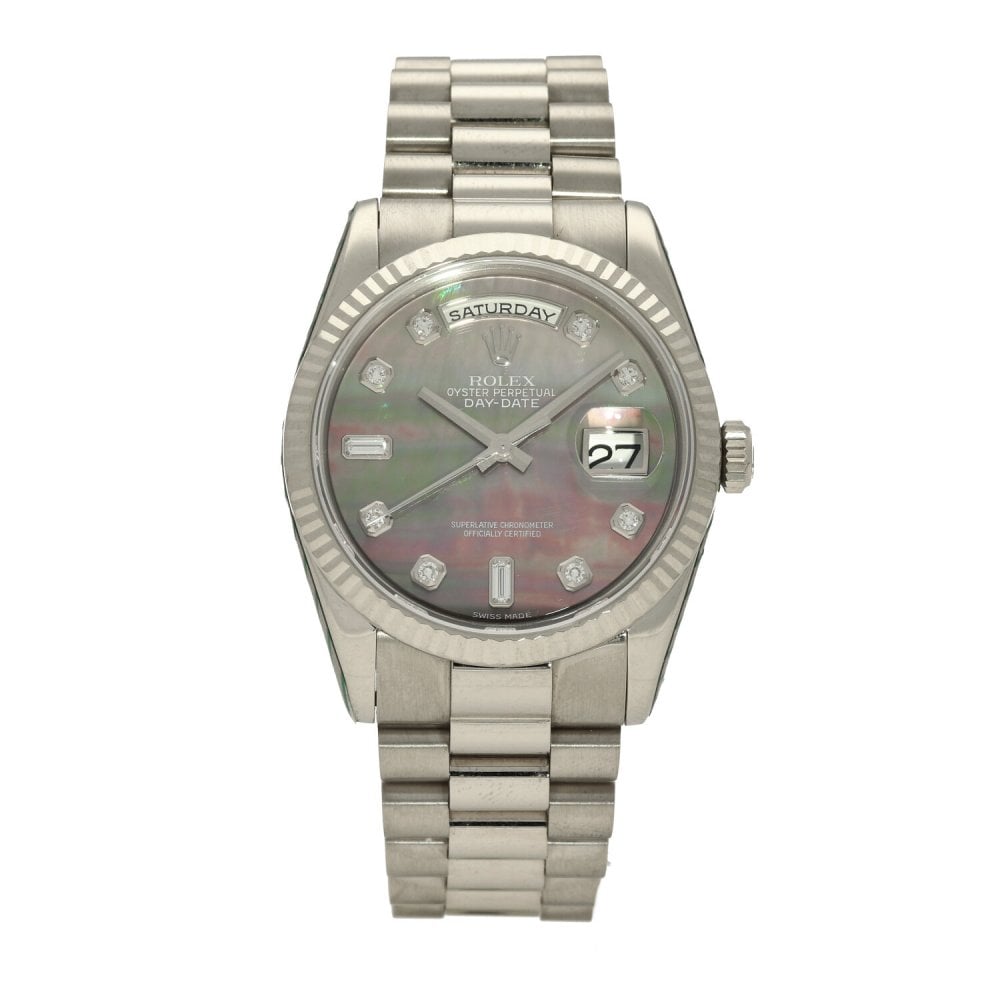 This Rolex Day-Date 118239 has a mother of pearl - black - diamond dial and a bracelet strap. This Rolex has undergone a thorough inspection of water resistance, accuracy, functionality and condition to determine the level of reconditioning required to meet our strict standards. It has also been referenced against technical documents and manufacturer records where available to ensure authenticity and a clean history. All our watches have a 24-month warranty for your peace of mind. One of our skilled polishing technicians has removed marks on the case and bracelet of this watch, brought about by daily wear and tear, which is why this watch does not come with the remaining manufacturer’s warranty.