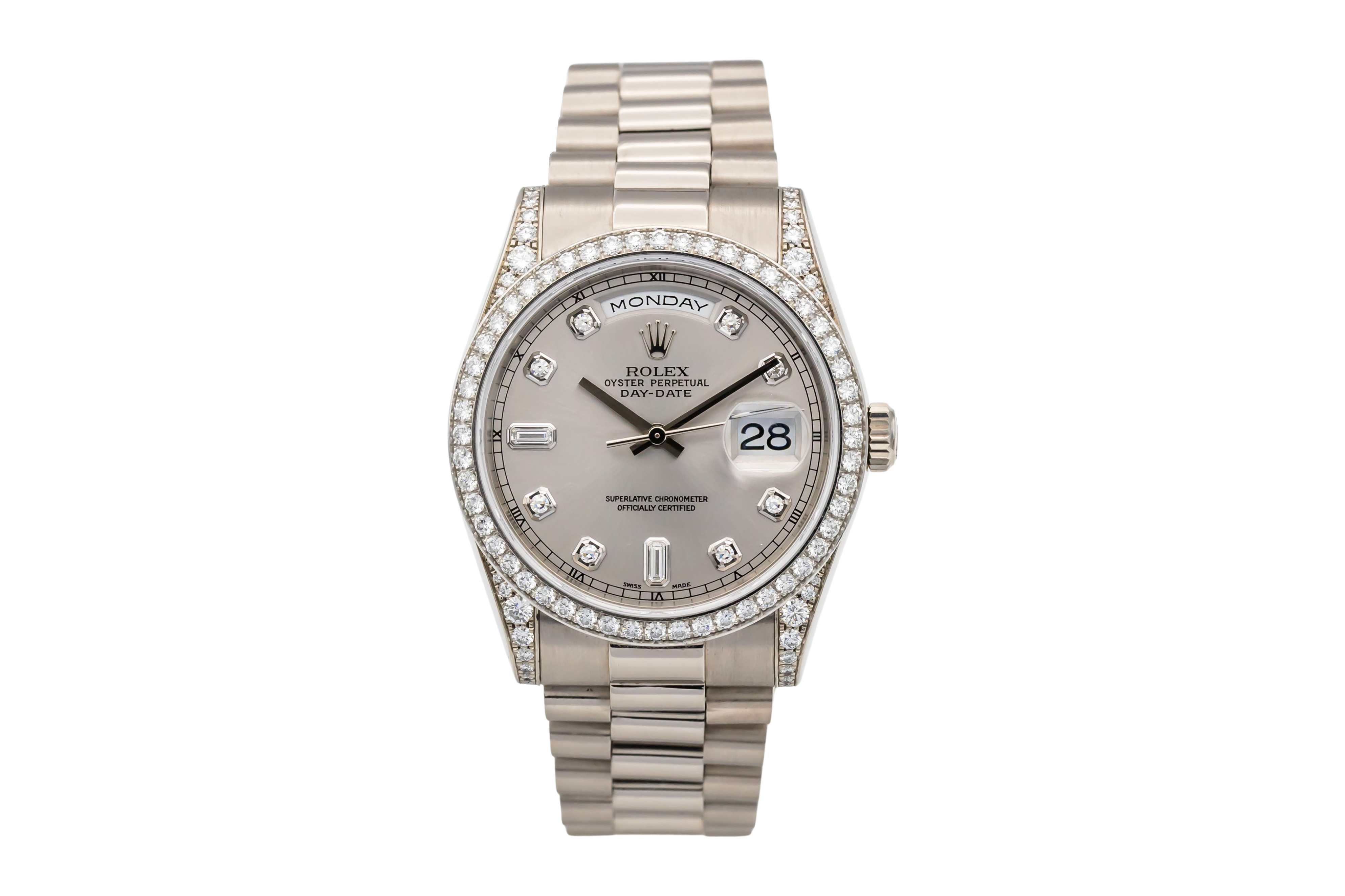 This Rolex Day-Date 118389 has a silver diamond dial and a bracelet strap. This Rolex has undergone a thorough inspection of water resistance, accuracy, functionality and condition to determine the level of reconditioning required to meet our strict standards. It has also been referenced against technical documents and manufacturer records where available to ensure authenticity and a clean history. All our watches have a 24-month warranty for your peace of mind. One of our skilled polishing technicians has removed marks on the case and bracelet of this watch, brought about by daily wear and tear, which is why this watch does not come with the remaining manufacturer’s warranty.