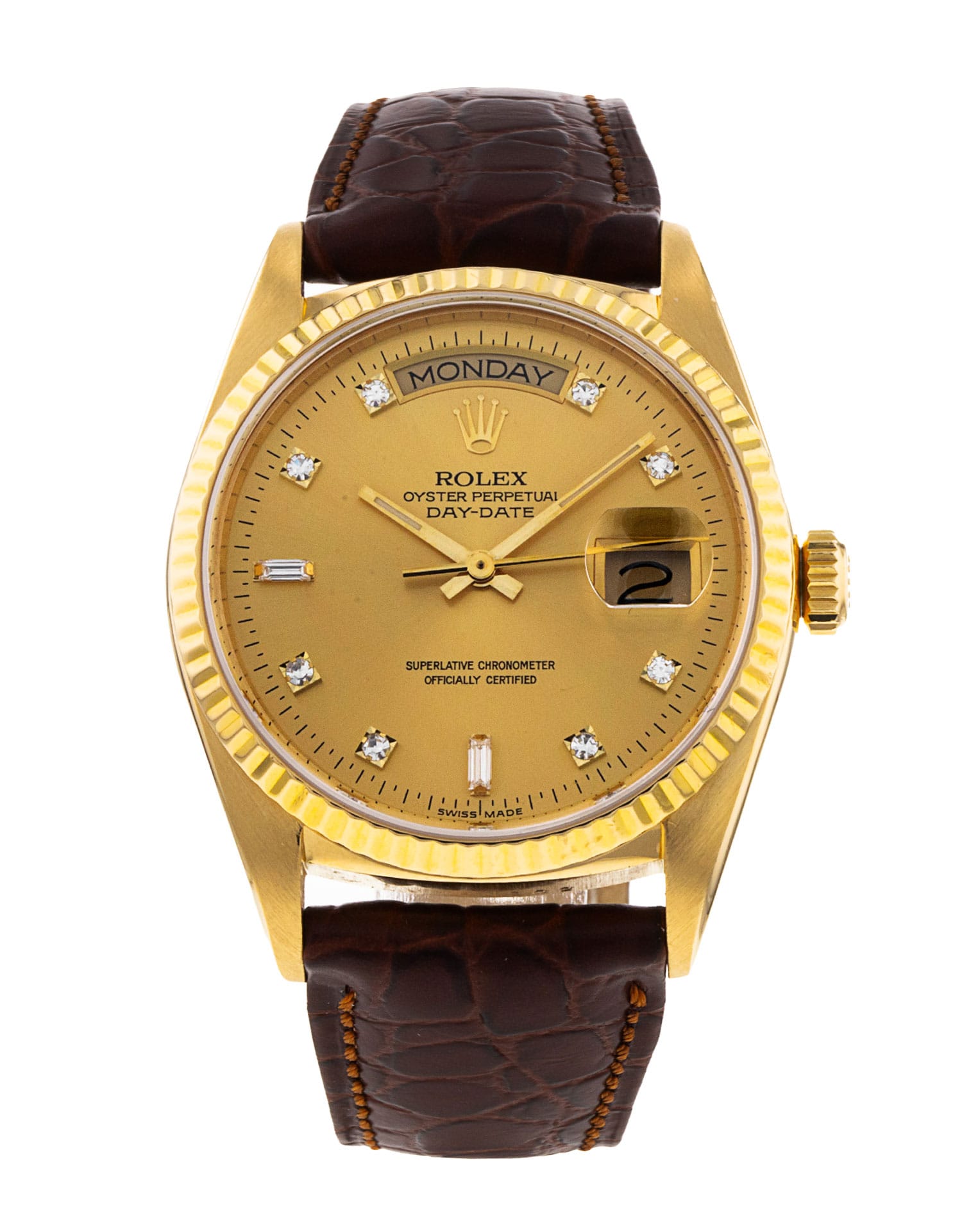 This Rolex Day-Date 18038 has a champagne diamond dial and a leather strap. This Rolex has undergone a thorough inspection of water resistance, accuracy, functionality and condition to determine the level of reconditioning required to meet our strict standards. It has also been referenced against technical documents and manufacturer records where available to ensure authenticity and a clean history. All our watches have a 24-month warranty for your peace of mind. One of our skilled polishing technicians has removed marks on the case and bracelet of this watch, brought about by daily wear and tear, which is why this watch does not come with the remaining manufacturer’s warranty.