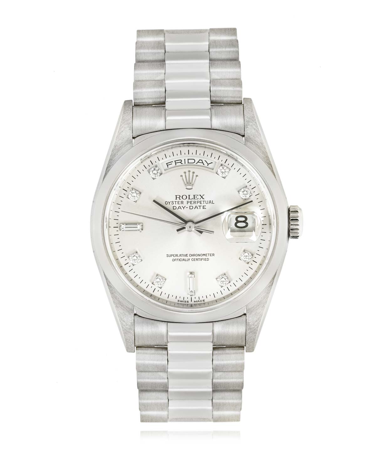 This Rolex Day-Date 18206 has a silver diamond dial and a bracelet strap. This Rolex has undergone a thorough inspection of water resistance, accuracy, functionality and condition to determine the level of reconditioning required to meet our strict standards. It has also been referenced against technical documents and manufacturer records where available to ensure authenticity and a clean history. All our watches have a 24-month warranty for your peace of mind. One of our skilled polishing technicians has removed marks on the case and bracelet of this watch, brought about by daily wear and tear, which is why this watch does not come with the remaining manufacturer’s warranty.