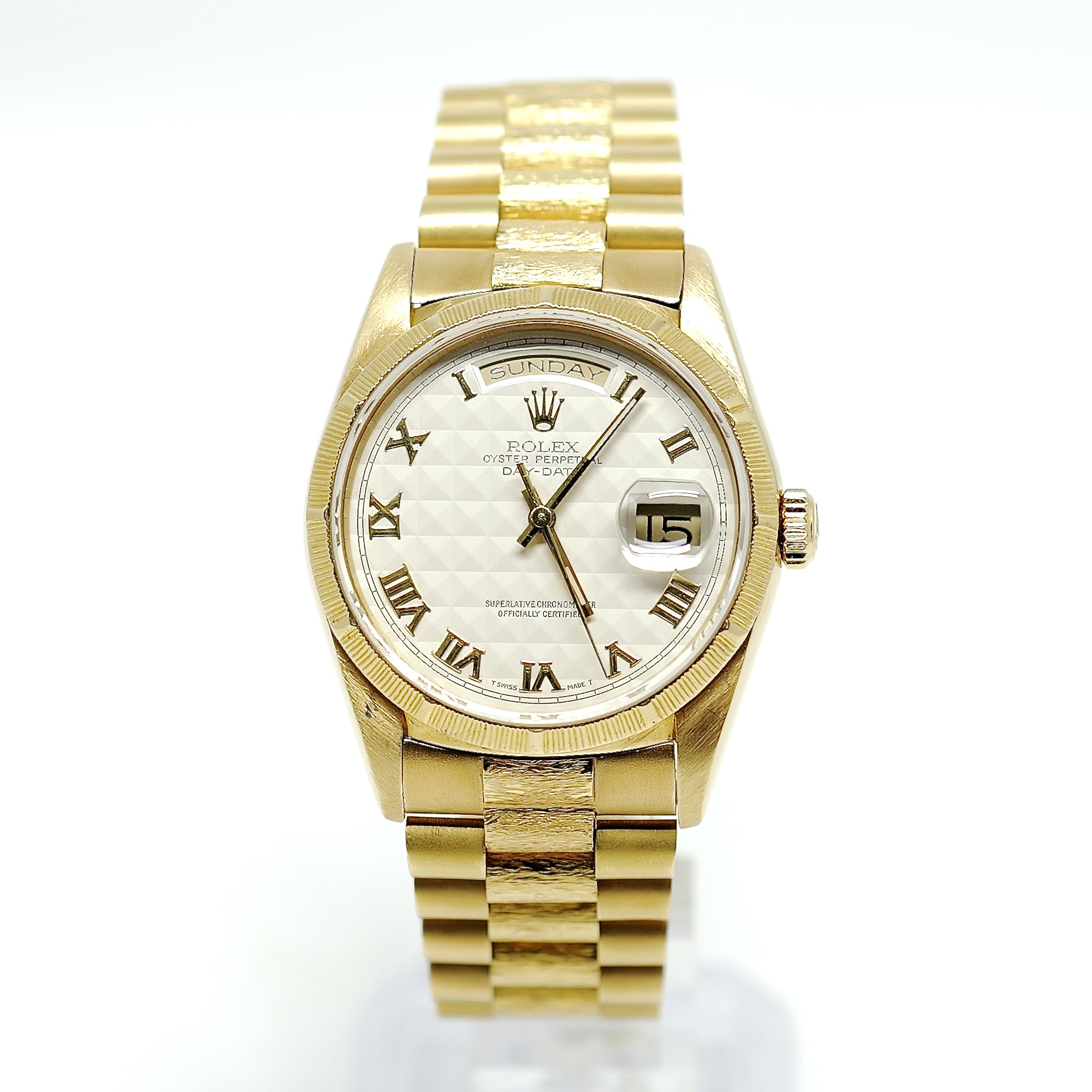 This Rolex Day-Date 18248 has a ivory roman numeral dial and a bracelet strap. This Rolex has undergone a thorough inspection of water resistance, accuracy, functionality and condition to determine the level of reconditioning required to meet our strict standards. It has also been referenced against technical documents and manufacturer records where available to ensure authenticity and a clean history. All our watches have a 24-month warranty for your peace of mind. One of our skilled polishing technicians has removed marks on the case and bracelet of this watch, brought about by daily wear and tear, which is why this watch does not come with the remaining manufacturer’s warranty.
