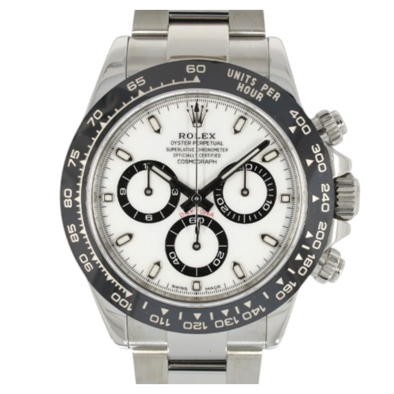 This Rolex Daytona 116500 LN has a white dial and a bracelet strap. This Rolex has undergone a thorough inspection of water resistance, accuracy, functionality and condition to determine the level of reconditioning required to meet our strict standards. It has also been referenced against technical documents and manufacturer records where available to ensure authenticity and a clean history. All our watches have a 24-month warranty for your peace of mind. One of our skilled polishing technicians has removed marks on the case and bracelet of this watch, brought about by daily wear and tear, which is why this watch does not come with the remaining manufacturer’s warranty.