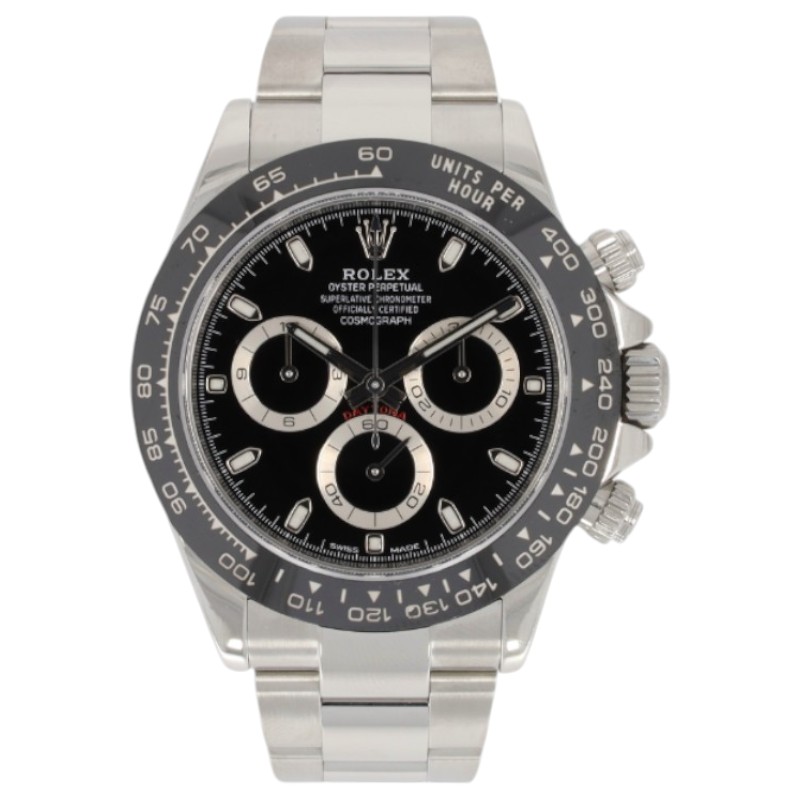 This Rolex Daytona 116500 LN has a black dial and a bracelet strap. This Rolex has undergone a thorough inspection of water resistance, accuracy, functionality and condition to determine the level of reconditioning required to meet our strict standards. It has also been referenced against technical documents and manufacturer records where available to ensure authenticity and a clean history. All our watches have a 24-month warranty for your peace of mind. One of our skilled polishing technicians has removed marks on the case and bracelet of this watch, brought about by daily wear and tear, which is why this watch does not come with the remaining manufacturer’s warranty.
