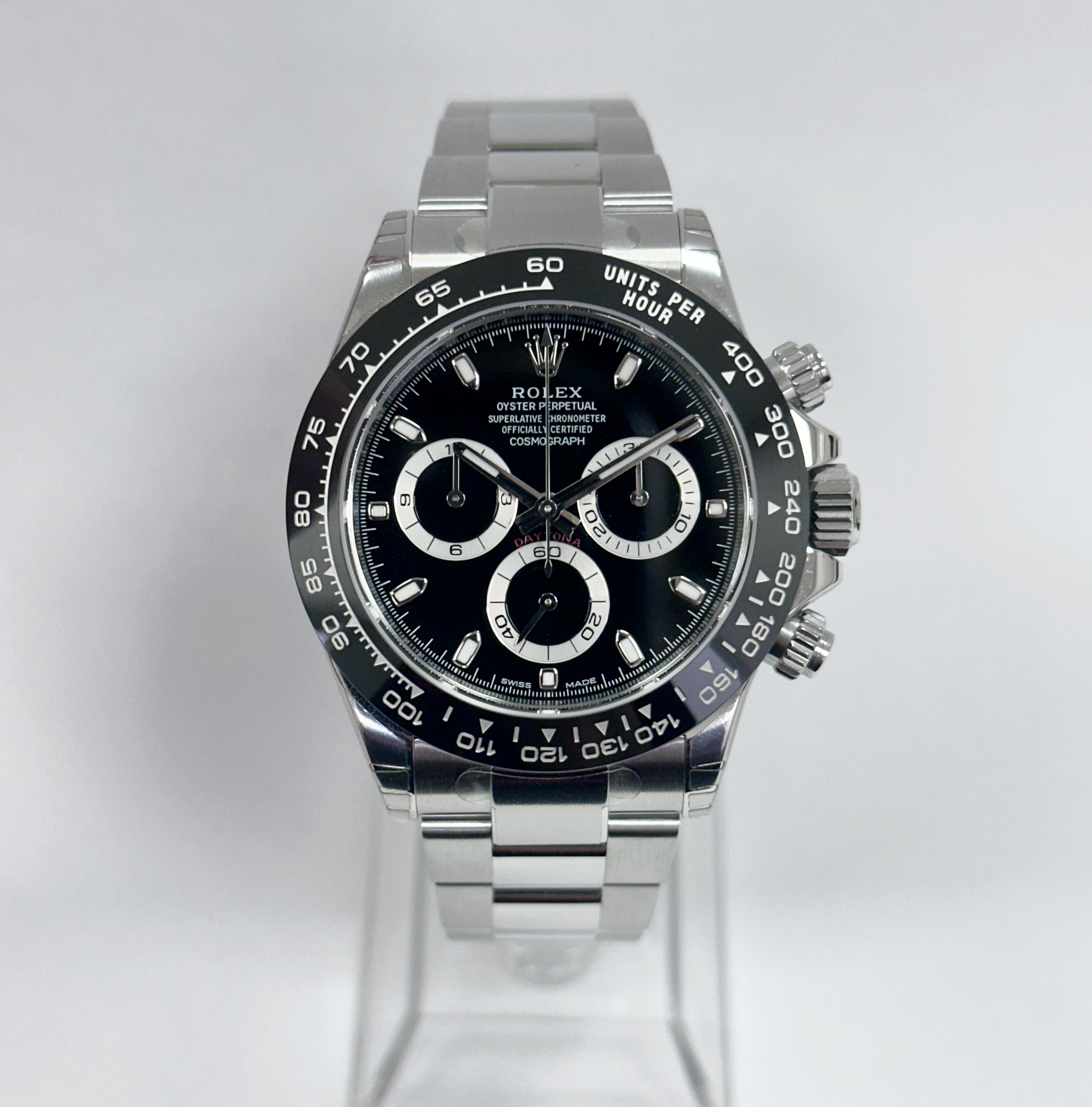 This Rolex Daytona 116500 LN has a black dial and a bracelet strap. This Rolex has undergone a thorough inspection of water resistance, accuracy, functionality and condition to determine the level of reconditioning required to meet our strict standards. It has also been referenced against technical documents and manufacturer records where available to ensure authenticity and a clean history. All our watches have a 24-month warranty for your peace of mind. One of our skilled polishing technicians has removed marks on the case and bracelet of this watch, brought about by daily wear and tear, which is why this watch does not come with the remaining manufacturer’s warranty.