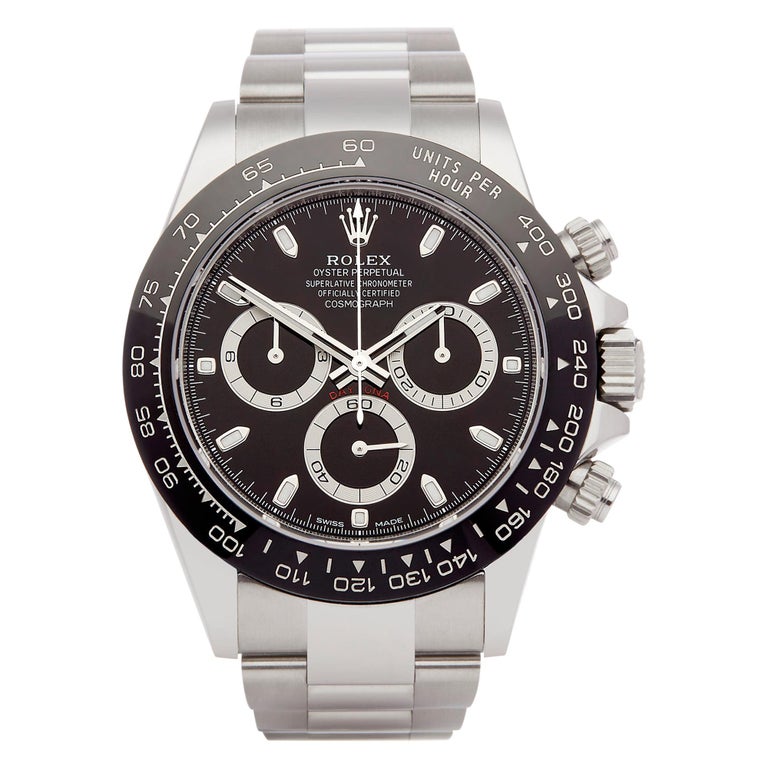 This Rolex Daytona 116500 LN has a black dial and a bracelet strap. This Rolex has undergone a thorough inspection of water resistance, accuracy, functionality and condition to determine the level of reconditioning required to meet our strict standards. It has also been referenced against technical documents and manufacturer records where available to ensure authenticity and a clean history. All our watches have a 24-month warranty for your peace of mind. One of our skilled polishing technicians has removed marks on the case and bracelet of this watch, brought about by daily wear and tear, which is why this watch does not come with the remaining manufacturer’s warranty.