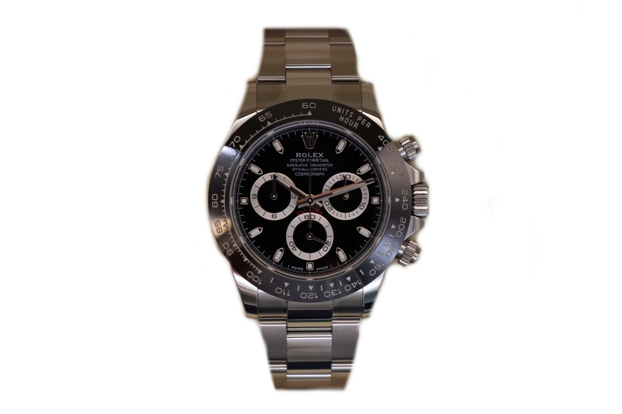 This Rolex Daytona 116500 LN has a black dial and a bracelet strap. This Rolex has undergone a thorough inspection of water resistance, accuracy, functionality and condition to determine the level of reconditioning required to meet our strict standards. It has also been referenced against technical documents and manufacturer records where available to ensure authenticity and a clean history. All our watches have a 24-month warranty for your peace of mind. One of our skilled polishing technicians has removed marks on the case and bracelet of this watch, brought about by daily wear and tear, which is why this watch does not come with the remaining manufacturer’s warranty.