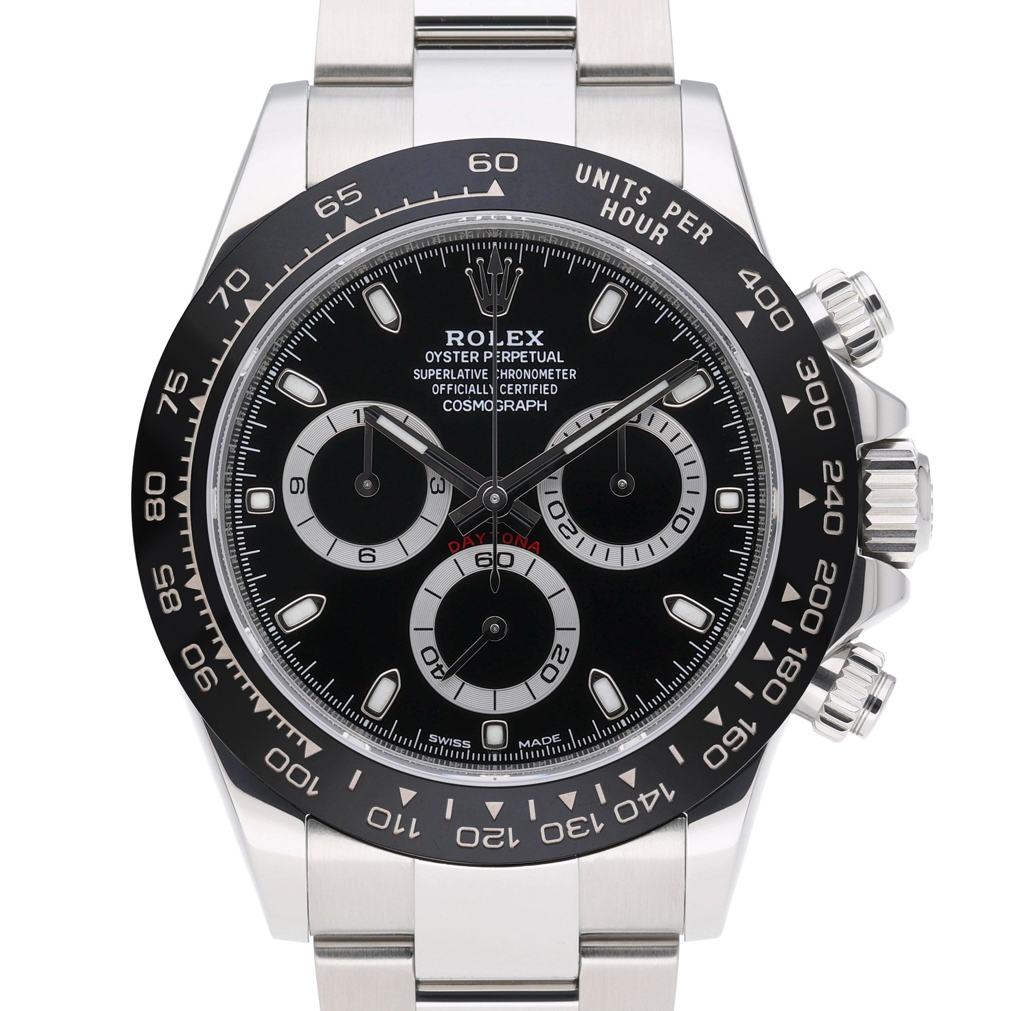 This Rolex Daytona 116500 LN has a black dial and a bracelet strap. This Rolex has undergone a thorough inspection of water resistance, accuracy, functionality and condition to determine the level of reconditioning required to meet our strict standards. It has also been referenced against technical documents and manufacturer records where available to ensure authenticity and a clean history. All our watches have a 24-month warranty for your peace of mind. One of our skilled polishing technicians has removed marks on the case and bracelet of this watch, brought about by daily wear and tear, which is why this watch does not come with the remaining manufacturer’s warranty.