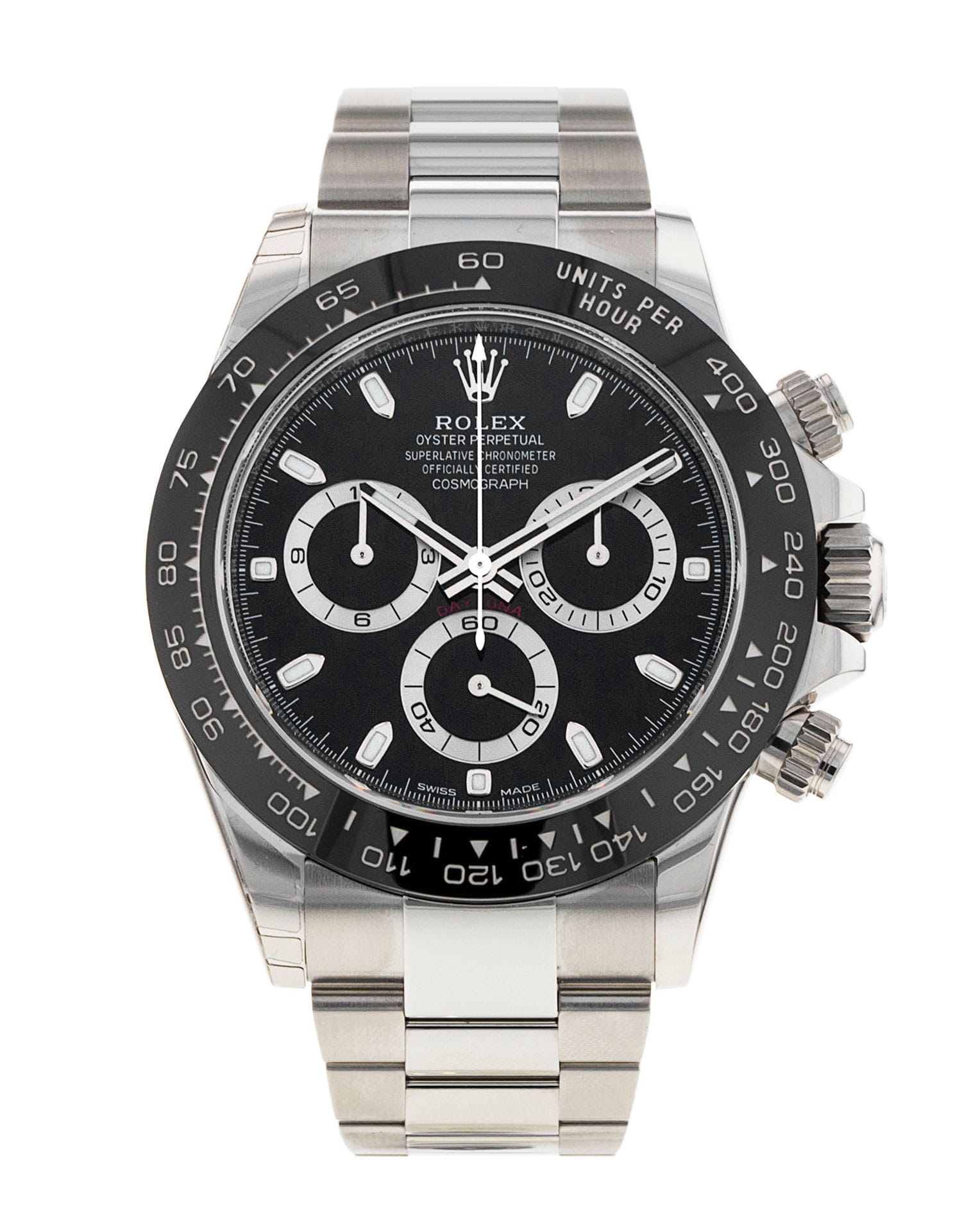 This Rolex Daytona 116500 LN has a black dial and a bracelet strap. This Rolex has undergone a thorough inspection of water resistance, accuracy, functionality and condition to determine the level of reconditioning required to meet our strict standards. It has also been referenced against technical documents and manufacturer records where available to ensure authenticity and a clean history. All our watches have a 24-month warranty for your peace of mind. One of our skilled polishing technicians has removed marks on the case and bracelet of this watch, brought about by daily wear and tear, which is why this watch does not come with the remaining manufacturer’s warranty.