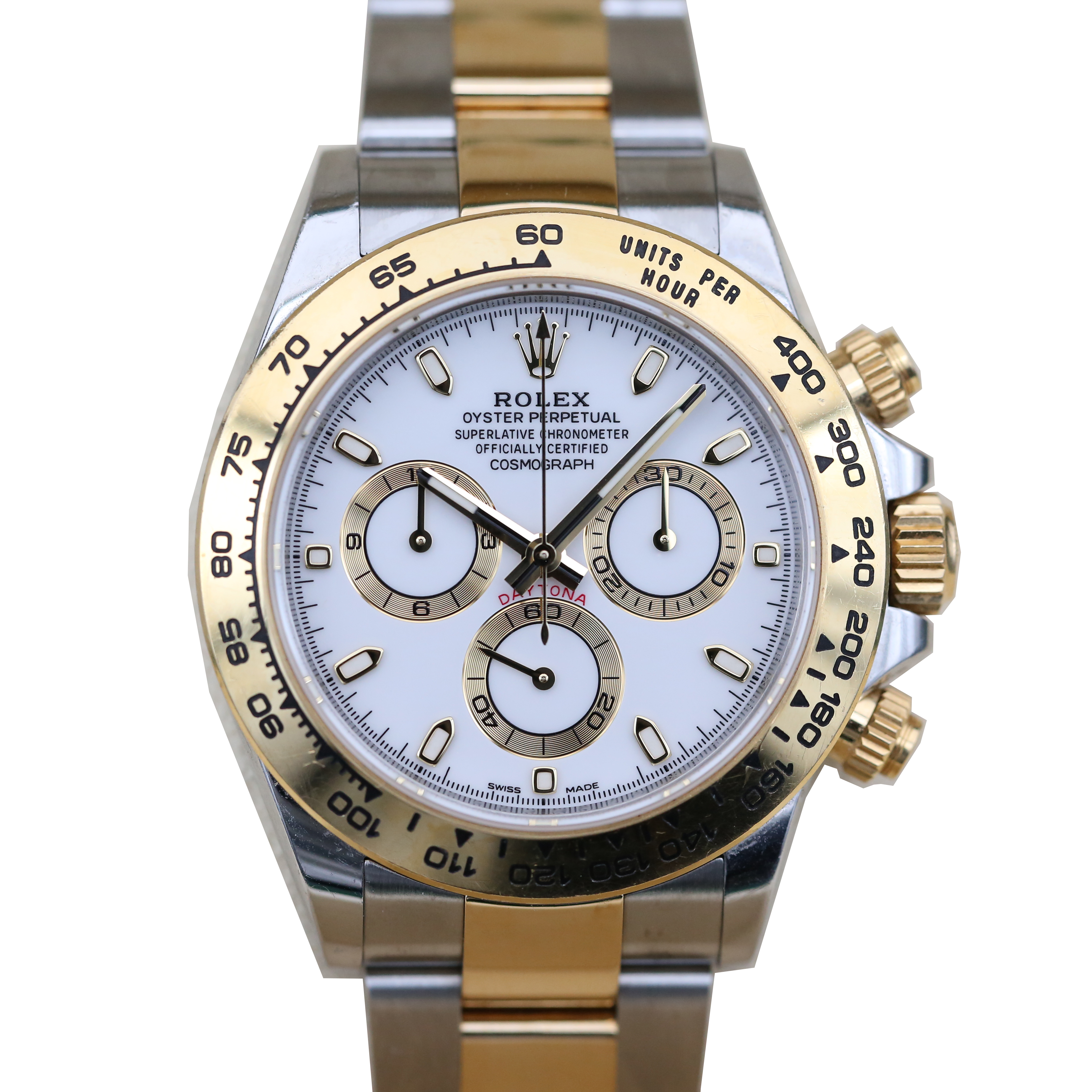 This Rolex Daytona 116503 has a white baton dial and a bracelet strap. This Rolex has undergone a thorough inspection of water resistance, accuracy, functionality and condition to determine the level of reconditioning required to meet our strict standards. It has also been referenced against technical documents and manufacturer records where available to ensure authenticity and a clean history. All our watches have a 24-month warranty for your peace of mind. One of our skilled polishing technicians has removed marks on the case and bracelet of this watch, brought about by daily wear and tear, which is why this watch does not come with the remaining manufacturer’s warranty.