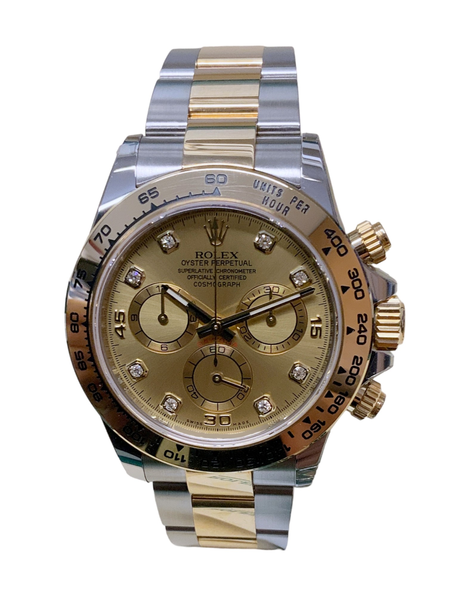This Rolex Daytona 116503 has a champagne diamond dial and a bracelet strap. This Rolex has undergone a thorough inspection of water resistance, accuracy, functionality and condition to determine the level of reconditioning required to meet our strict standards. It has also been referenced against technical documents and manufacturer records where available to ensure authenticity and a clean history. All our watches have a 24-month warranty for your peace of mind. One of our skilled polishing technicians has removed marks on the case and bracelet of this watch, brought about by daily wear and tear, which is why this watch does not come with the remaining manufacturer’s warranty.