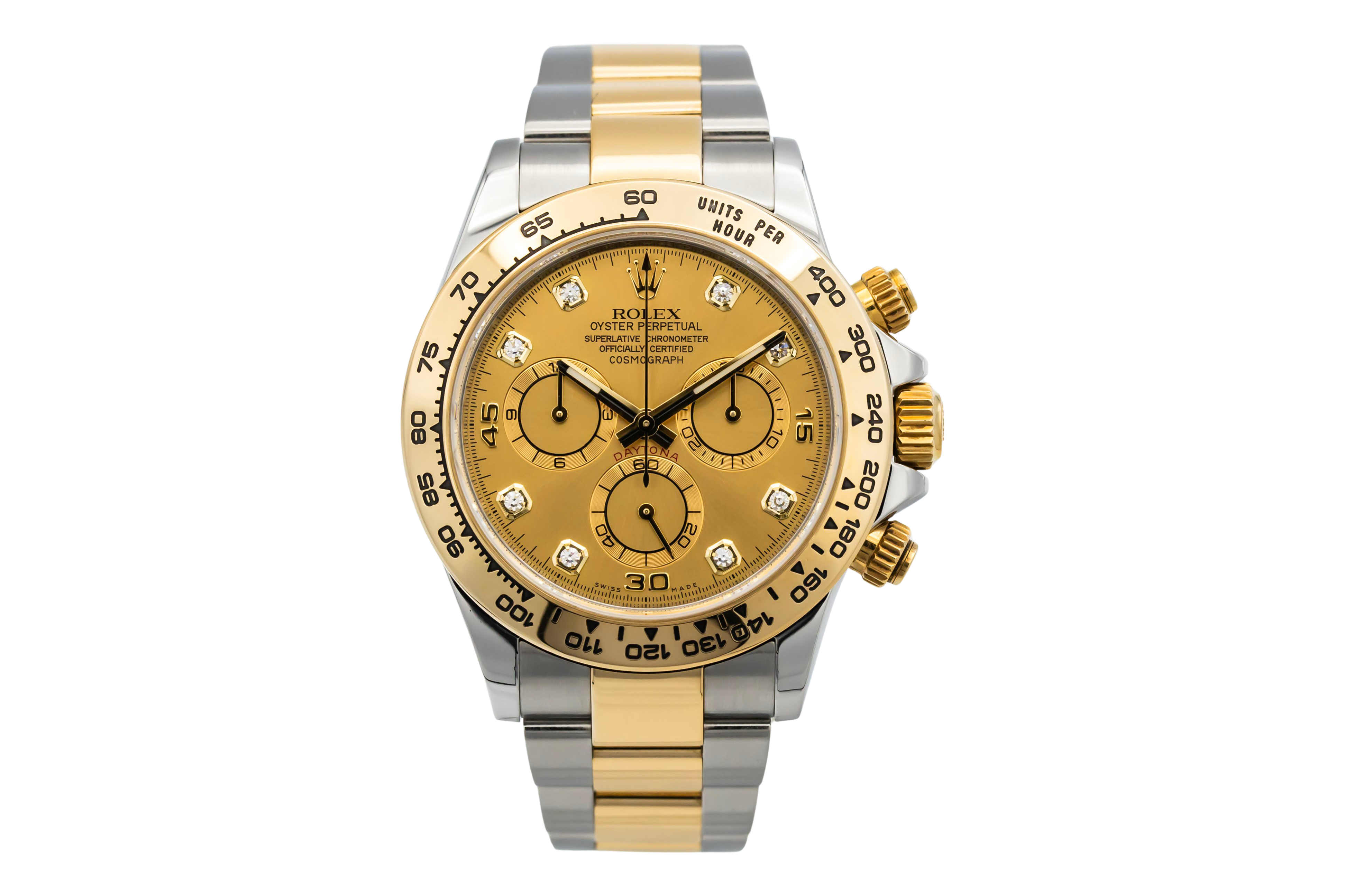 This Rolex Daytona 116503 has a champagne diamond dial and a bracelet strap. This Rolex has undergone a thorough inspection of water resistance, accuracy, functionality and condition to determine the level of reconditioning required to meet our strict standards. It has also been referenced against technical documents and manufacturer records where available to ensure authenticity and a clean history. All our watches have a 24-month warranty for your peace of mind. One of our skilled polishing technicians has removed marks on the case and bracelet of this watch, brought about by daily wear and tear, which is why this watch does not come with the remaining manufacturer’s warranty.