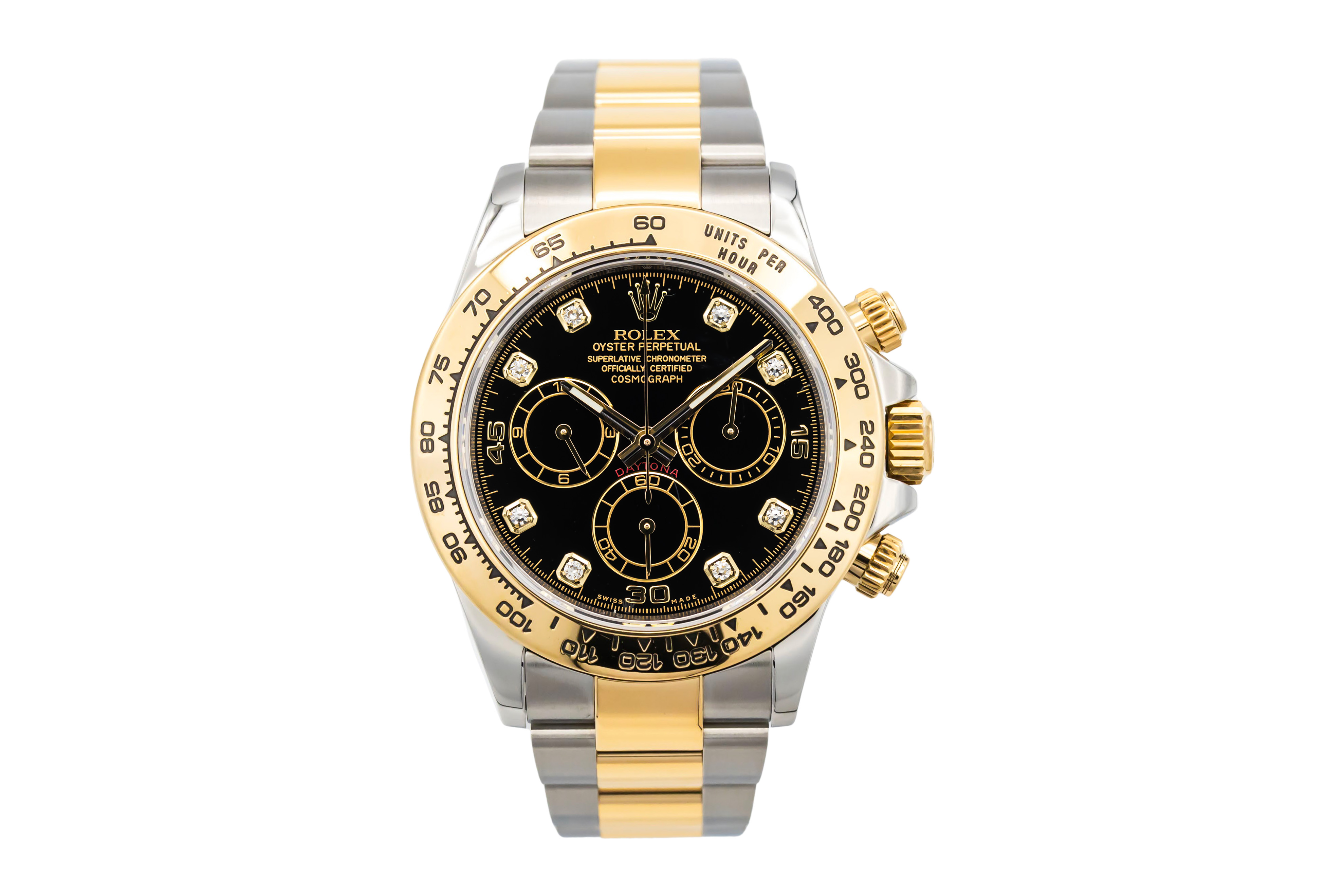 This Rolex Daytona 116503 has a black diamond dial and a bracelet strap. This Rolex has undergone a thorough inspection of water resistance, accuracy, functionality and condition to determine the level of reconditioning required to meet our strict standards. It has also been referenced against technical documents and manufacturer records where available to ensure authenticity and a clean history. All our watches have a 24-month warranty for your peace of mind. One of our skilled polishing technicians has removed marks on the case and bracelet of this watch, brought about by daily wear and tear, which is why this watch does not come with the remaining manufacturer’s warranty.