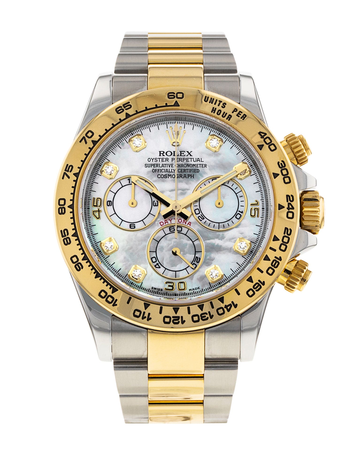 This Rolex Daytona 116503 has a mother of pearl white - diamond dial and a bracelet strap. This Rolex has undergone a thorough inspection of water resistance, accuracy, functionality and condition to determine the level of reconditioning required to meet our strict standards. It has also been referenced against technical documents and manufacturer records where available to ensure authenticity and a clean history. All our watches have a 24-month warranty for your peace of mind. One of our skilled polishing technicians has removed marks on the case and bracelet of this watch, brought about by daily wear and tear, which is why this watch does not come with the remaining manufacturer’s warranty.