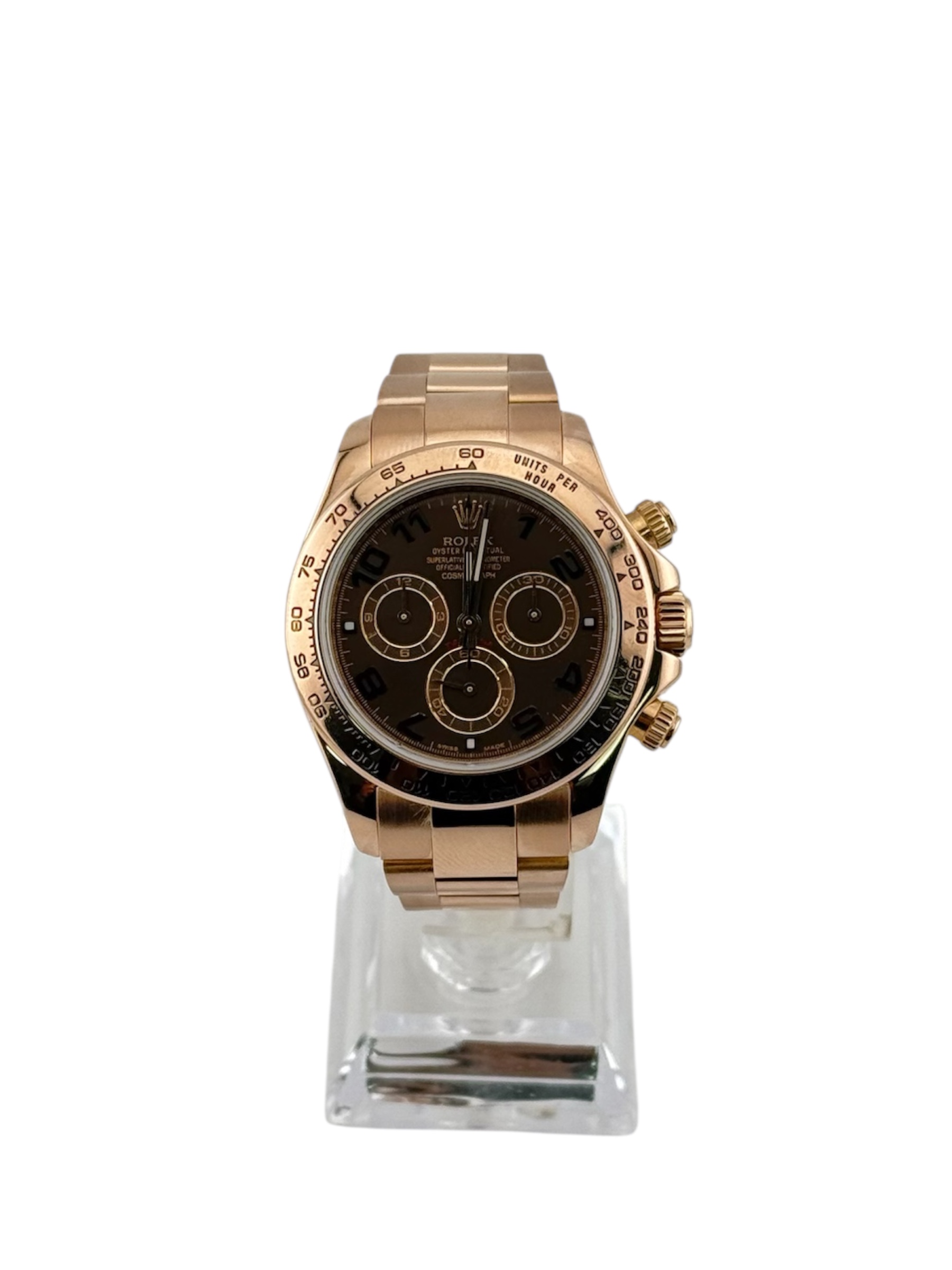 This Rolex Daytona 116505 has a chocolate arabic dial and a bracelet strap. This Rolex has undergone a thorough inspection of water resistance, accuracy, functionality and condition to determine the level of reconditioning required to meet our strict standards. It has also been referenced against technical documents and manufacturer records where available to ensure authenticity and a clean history. All our watches have a 24-month warranty for your peace of mind. One of our skilled polishing technicians has removed marks on the case and bracelet of this watch, brought about by daily wear and tear, which is why this watch does not come with the remaining manufacturer’s warranty.
