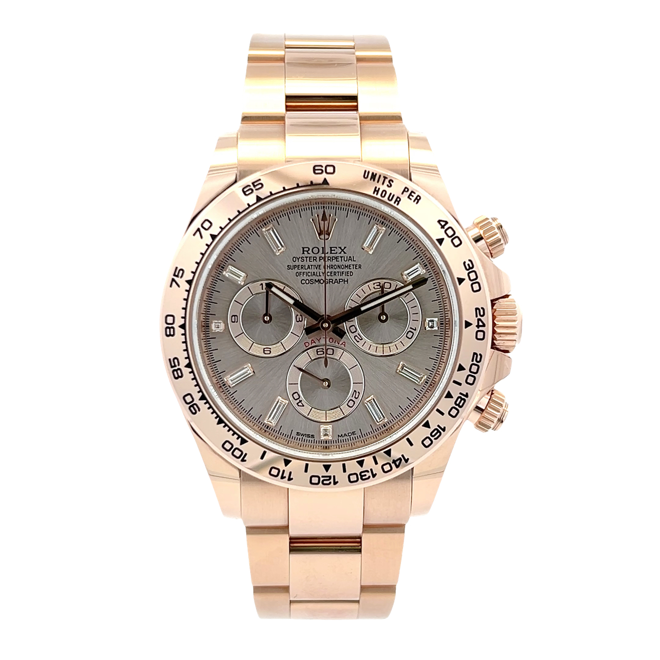 This Rolex Daytona 116505 has a rose baton diamond baguette dial and a bracelet strap. This Rolex has undergone a thorough inspection of water resistance, accuracy, functionality and condition to determine the level of reconditioning required to meet our strict standards. It has also been referenced against technical documents and manufacturer records where available to ensure authenticity and a clean history. Our watches have a 24-month warranty for your peace of mind, in conjunction with any remaining manufacturer’s warranty from new or from service. To maintain the manufacturer’s warranty on this watch, it has not been polished in our service centre.
