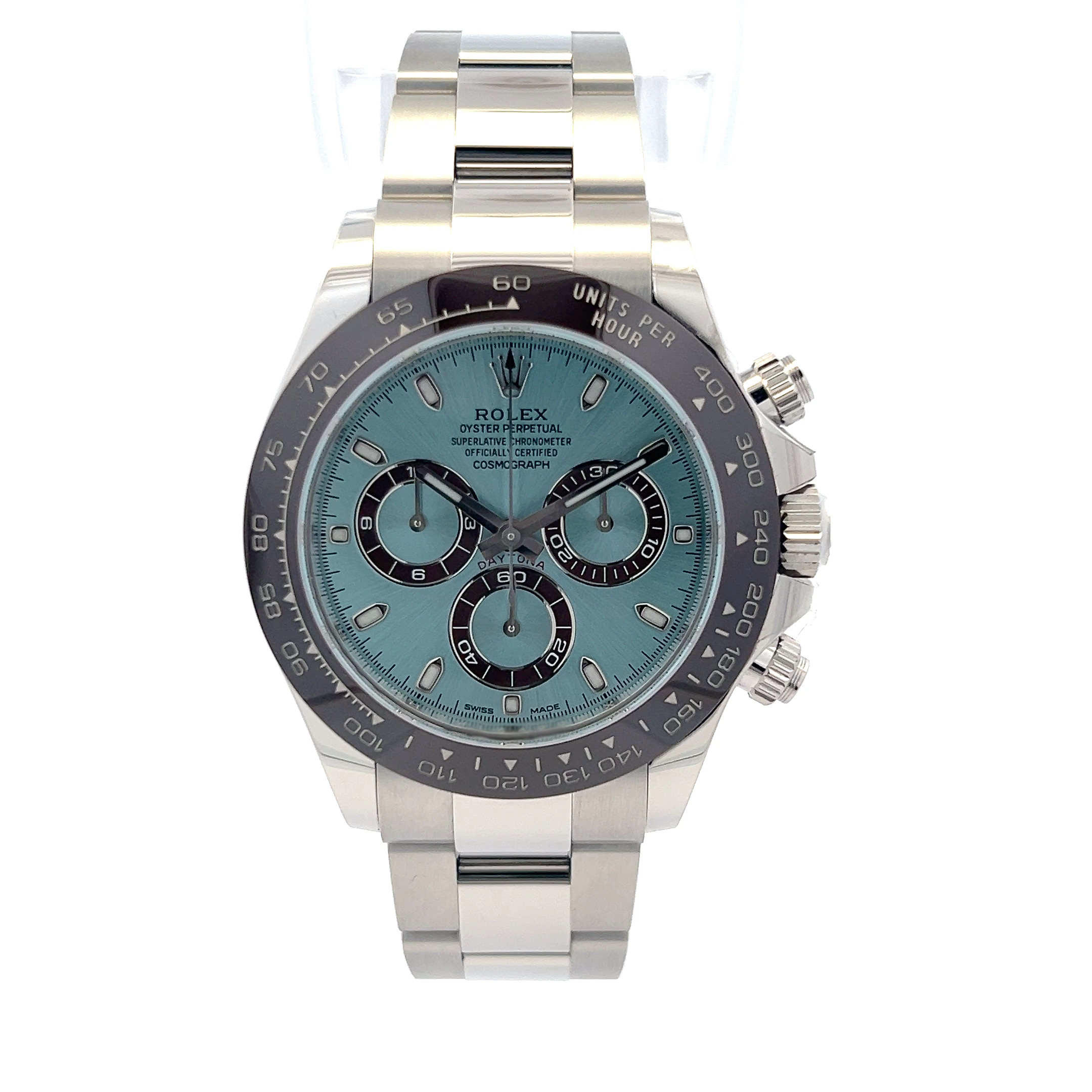 This Rolex Daytona 116506 has a ice blue baton dial and a bracelet strap. This Rolex has undergone a thorough inspection of water resistance, accuracy, functionality and condition to determine the level of reconditioning required to meet our strict standards. It has also been referenced against technical documents and manufacturer records where available to ensure authenticity and a clean history. Our watches have a 24-month warranty for your peace of mind, in conjunction with any remaining manufacturer’s warranty from new or from service. To maintain the manufacturer’s warranty on this watch, it has not been polished in our service centre.