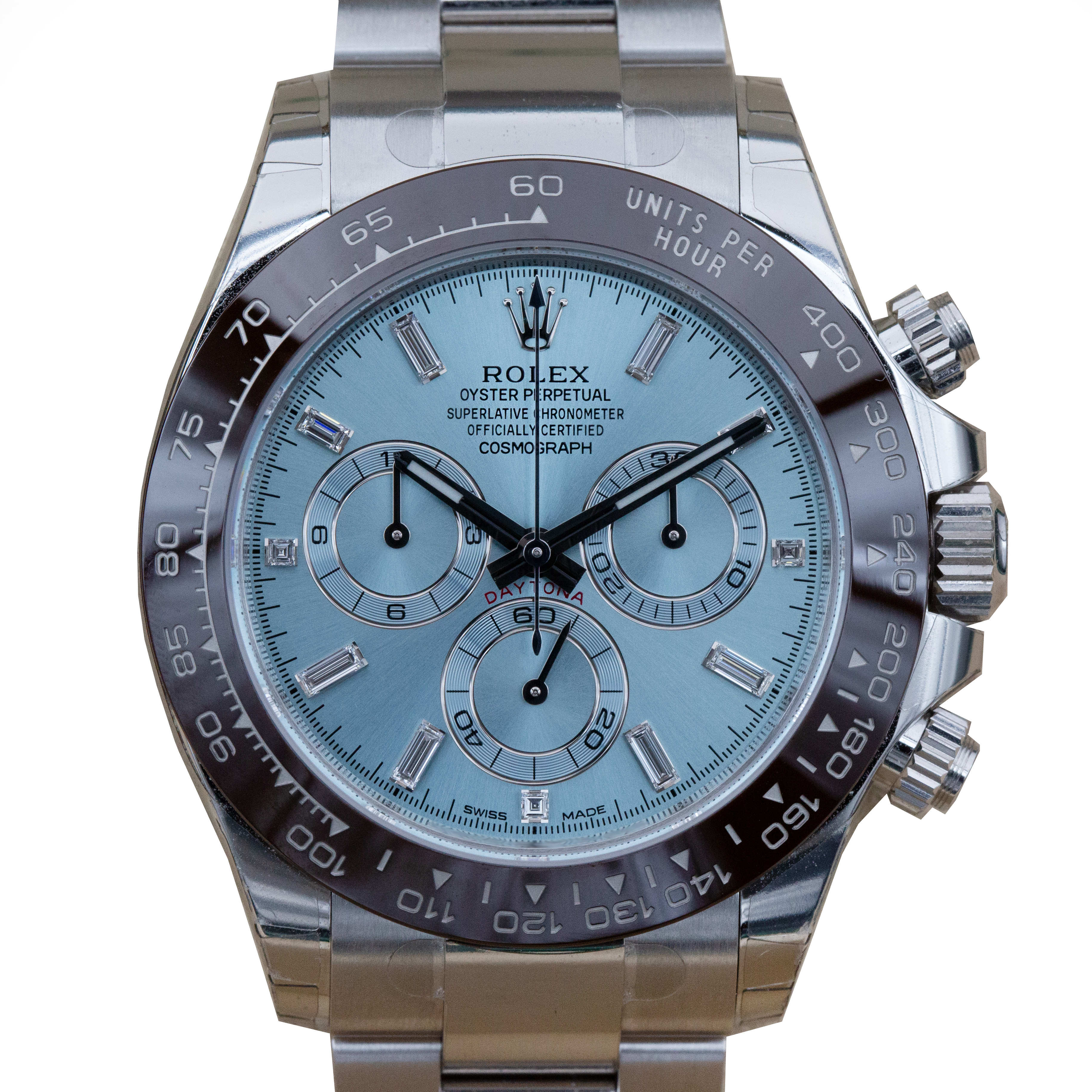 This Rolex Daytona 116506 has a ice blue diamond dial and a bracelet strap. This Rolex has undergone a thorough inspection of water resistance, accuracy, functionality and condition to determine the level of reconditioning required to meet our strict standards. It has also been referenced against technical documents and manufacturer records where available to ensure authenticity and a clean history. All our watches have a 24-month warranty for your peace of mind. One of our skilled polishing technicians has removed marks on the case and bracelet of this watch, brought about by daily wear and tear, which is why this watch does not come with the remaining manufacturer’s warranty.