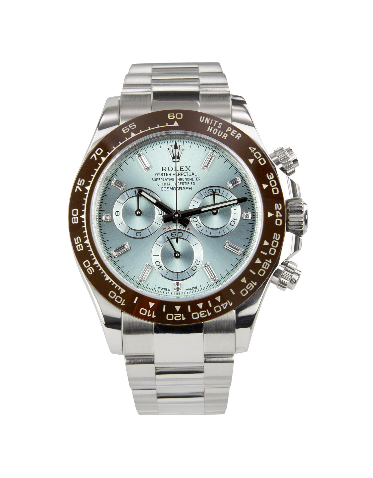 This beautiful reference 116506 is the exclusive Daytona model released by Rolex to celebrate the iconic watch's 50th birthday. With a glorious platinum case (the first Cosmograph to win this honour), the watch is a close cousin of the great ref. 116520, and has the same stunning in-house movement: the 4130, which is the first Rolex calibre to use ceramic ball bearings in the automatic winding system. Where this watch differs is in the rich brown ceramic bezel (and subdials) and the striking “ice blue” dial – possibly an homage to the piercing eyes of Rolex darling Paul Newman, who is particularly associated with the Daytona and its exceptional racing watch legacy.
