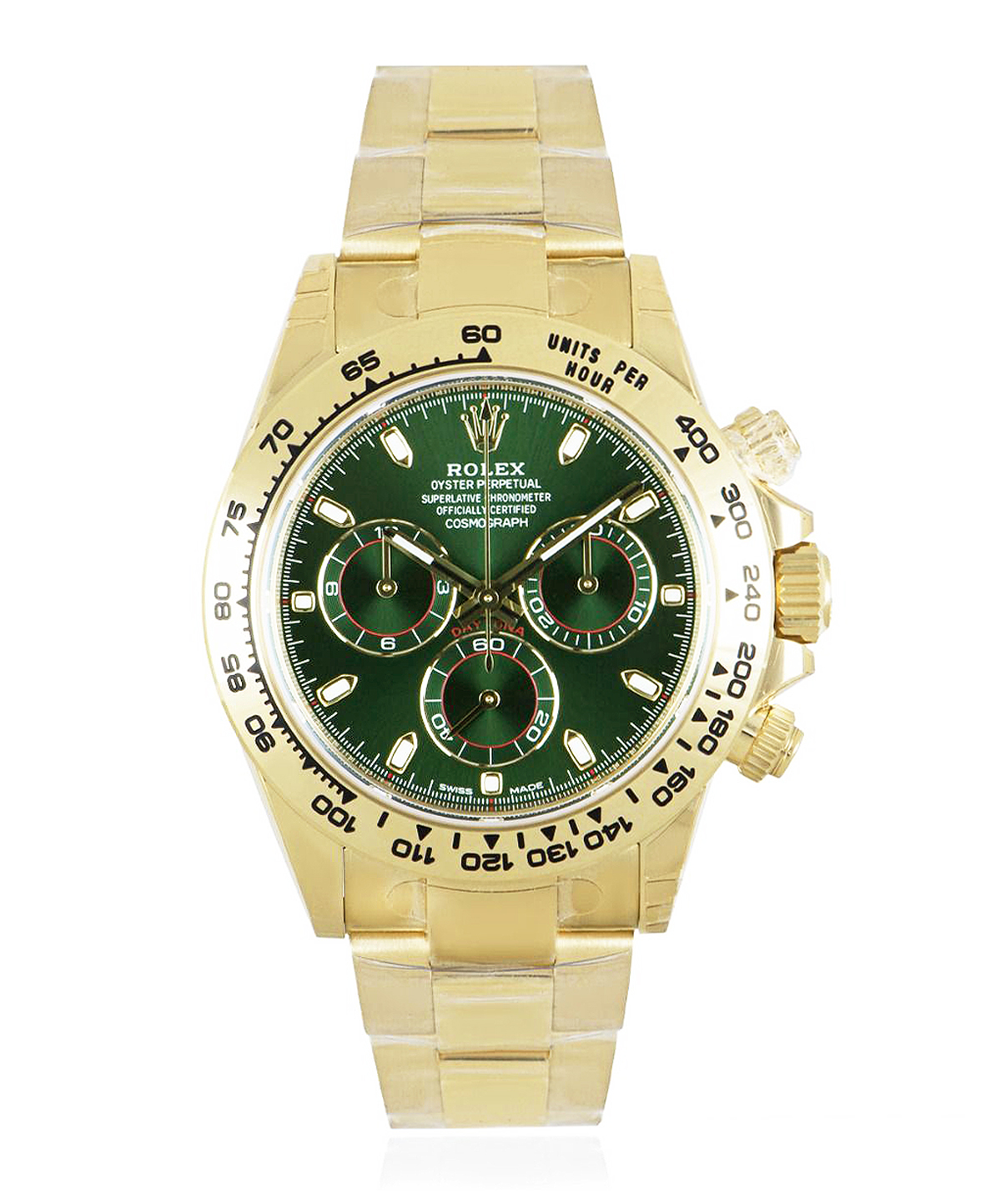 This Rolex Daytona 116508 has a green baton dial and a bracelet strap. This Rolex has undergone a thorough inspection of water resistance, accuracy, functionality and condition to determine the level of reconditioning required to meet our strict standards. It has also been referenced against technical documents and manufacturer records where available to ensure authenticity and a clean history. All our watches have a 24-month warranty for your peace of mind. One of our skilled polishing technicians has removed marks on the case and bracelet of this watch, brought about by daily wear and tear, which is why this watch does not come with the remaining manufacturer’s warranty.