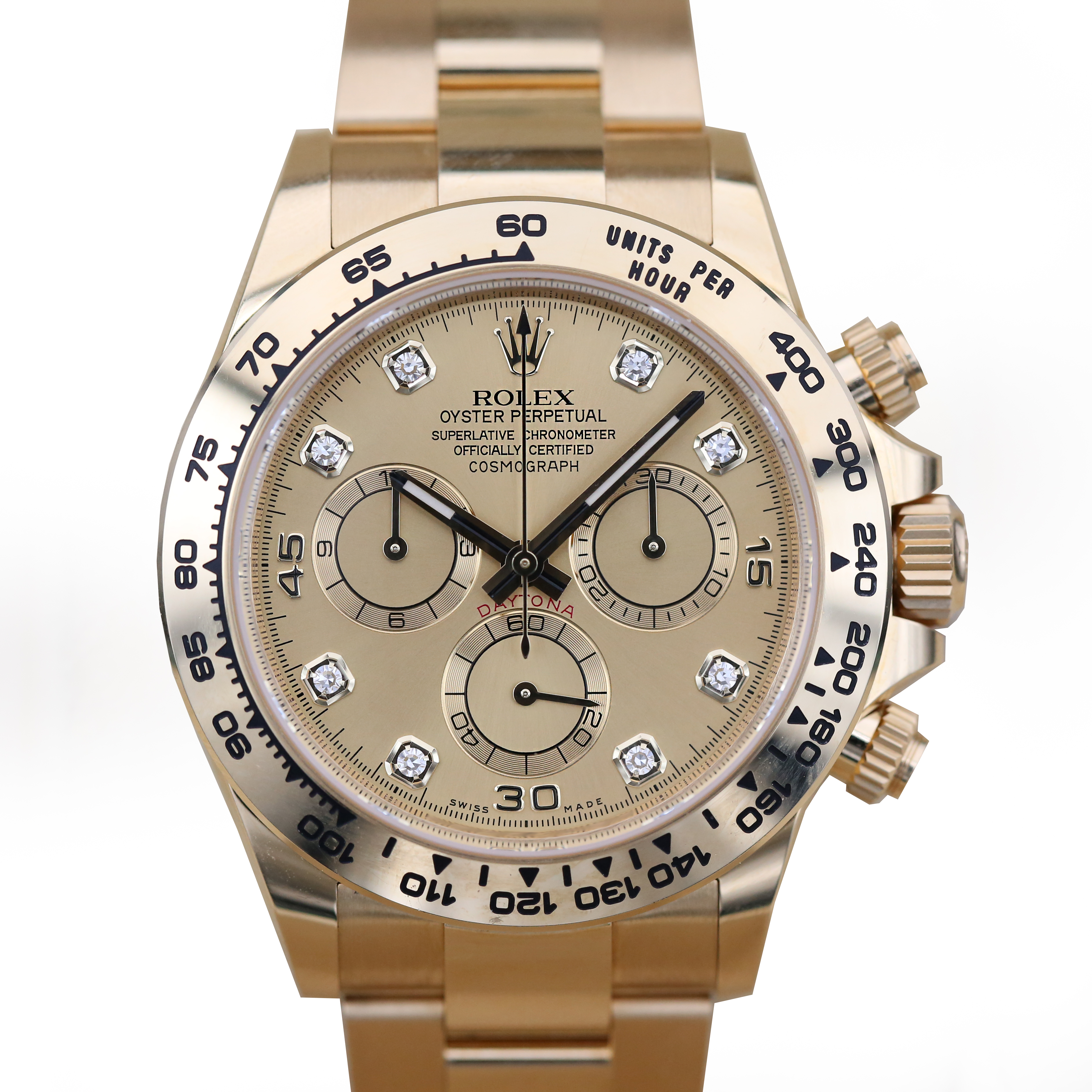 This Rolex Daytona 116508 has a champagne diamond dial and a bracelet strap. This Rolex has undergone a thorough inspection of water resistance, accuracy, functionality and condition to determine the level of reconditioning required to meet our strict standards. It has also been referenced against technical documents and manufacturer records where available to ensure authenticity and a clean history. Our watches have a 24-month warranty for your peace of mind, in conjunction with any remaining manufacturer’s warranty from new or from service. To maintain the manufacturer’s warranty on this watch, it has not been polished in our service centre.