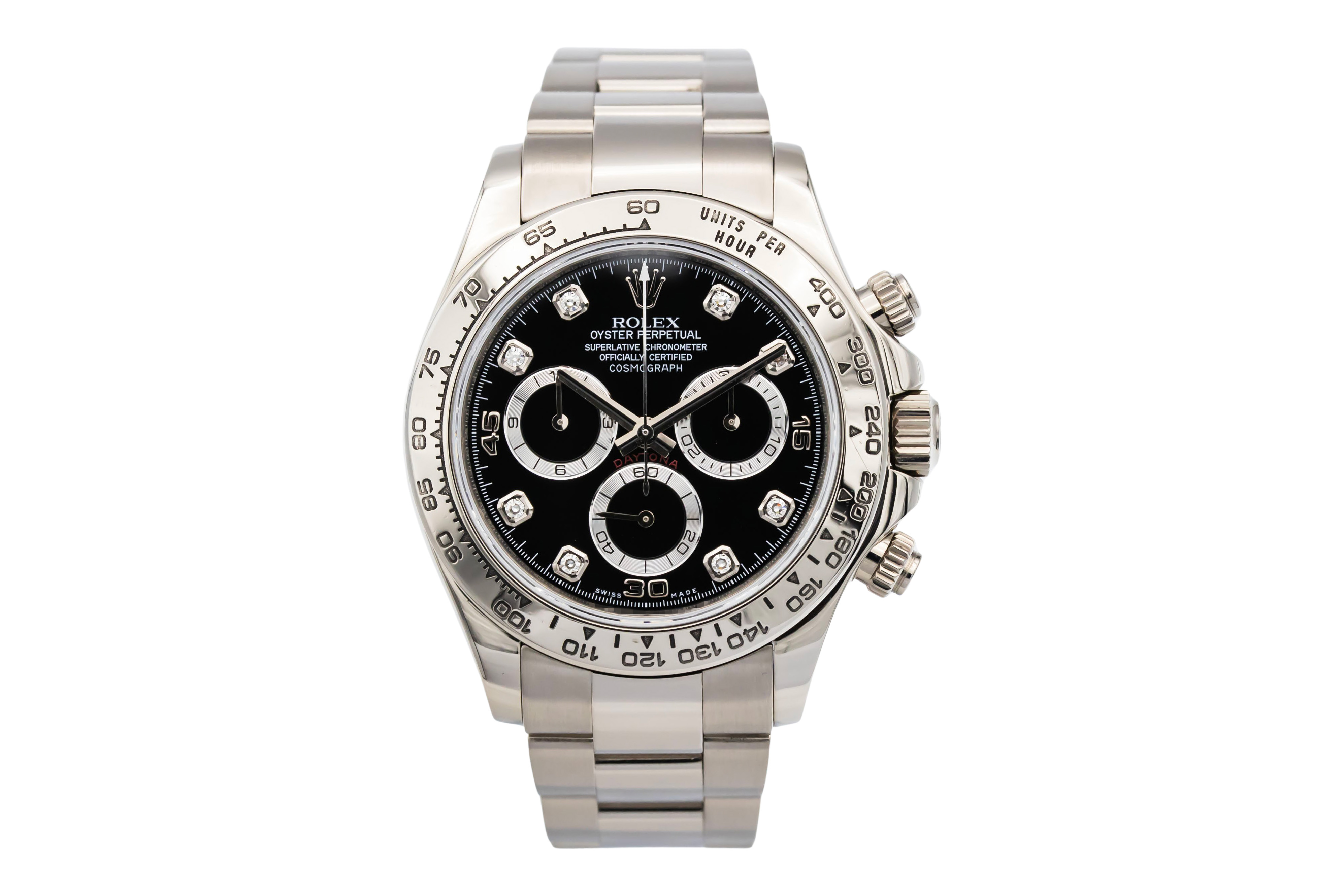 This Rolex Daytona 116509 has a black diamond dial and a bracelet strap. This Rolex has undergone a thorough inspection of water resistance, accuracy, functionality and condition to determine the level of reconditioning required to meet our strict standards. It has also been referenced against technical documents and manufacturer records where available to ensure authenticity and a clean history. All our watches have a 24-month warranty for your peace of mind. One of our skilled polishing technicians has removed marks on the case and bracelet of this watch, brought about by daily wear and tear, which is why this watch does not come with the remaining manufacturer’s warranty.