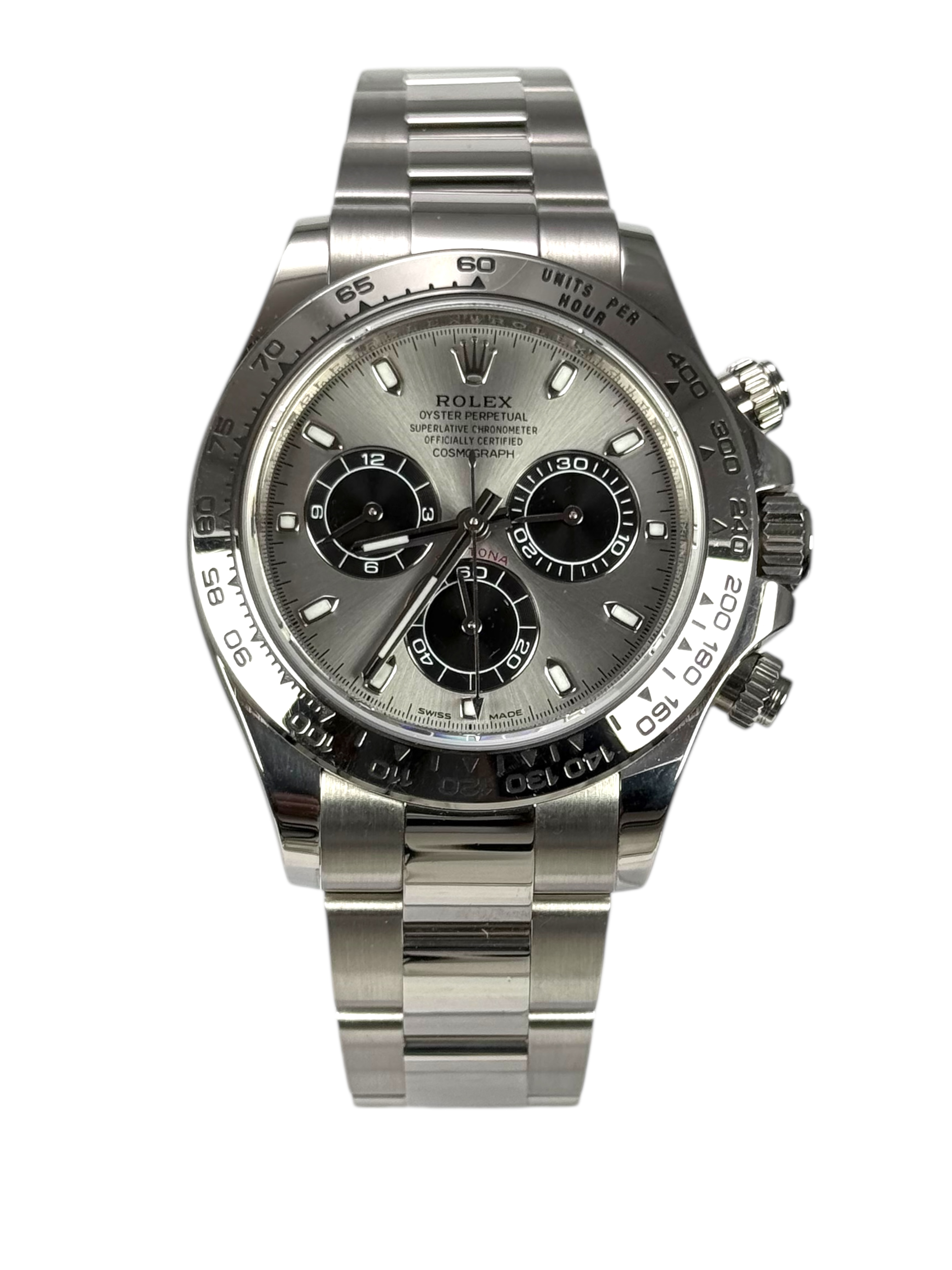 This Rolex Daytona 116509 has a steel & black dial and a bracelet strap. This Rolex has undergone a thorough inspection of water resistance, accuracy, functionality and condition to determine the level of reconditioning required to meet our strict standards. It has also been referenced against technical documents and manufacturer records where available to ensure authenticity and a clean history. All our watches have a 24-month warranty for your peace of mind. One of our skilled polishing technicians has removed marks on the case and bracelet of this watch, brought about by daily wear and tear, which is why this watch does not come with the remaining manufacturer’s warranty.