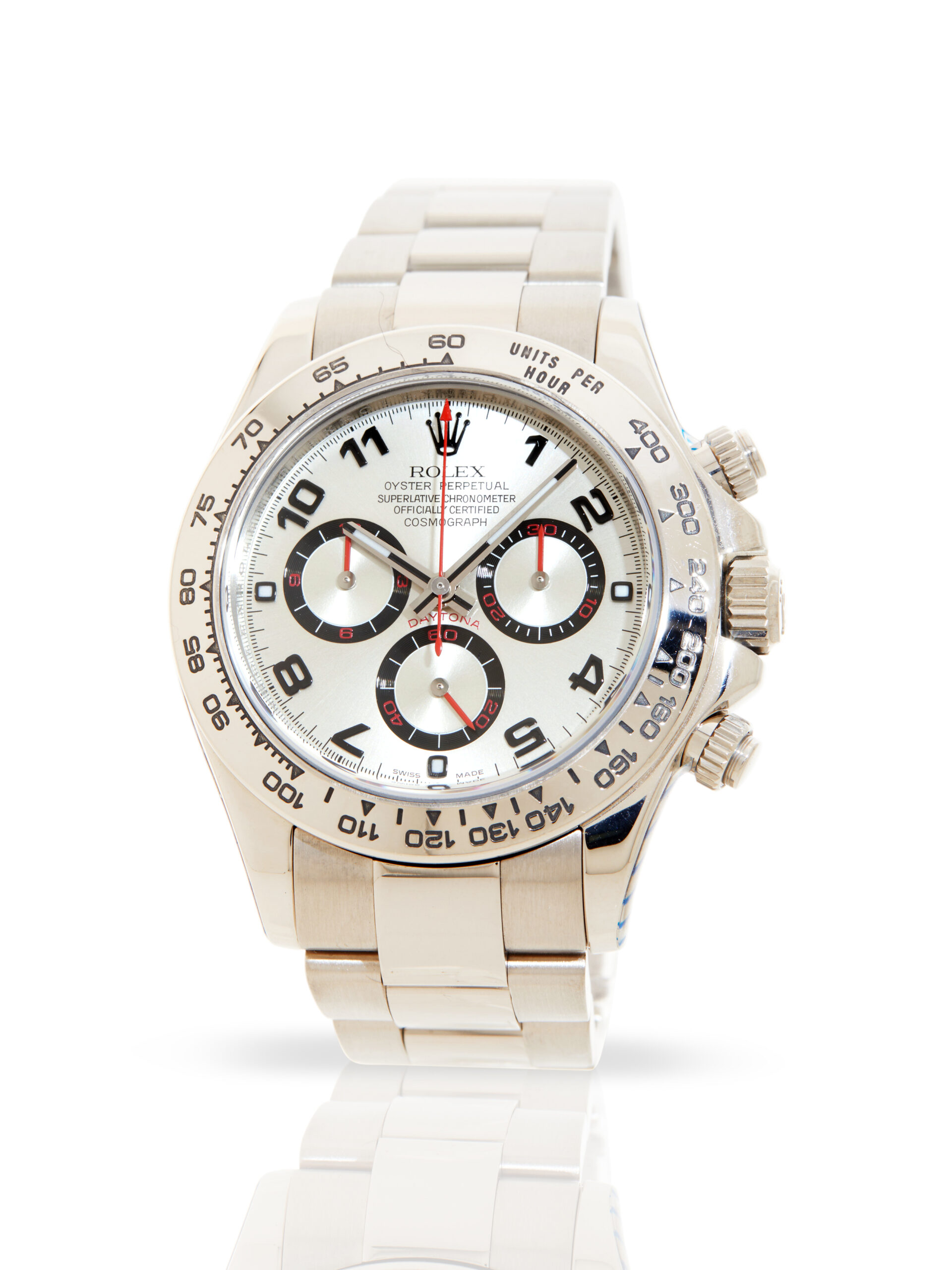 This Rolex Daytona 116509 has a silver arabic dial and a bracelet strap. This Rolex has undergone a thorough inspection of water resistance, accuracy, functionality and condition to determine the level of reconditioning required to meet our strict standards. It has also been referenced against technical documents and manufacturer records where available to ensure authenticity and a clean history. All our watches have a 24-month warranty for your peace of mind. One of our skilled polishing technicians has removed marks on the case and bracelet of this watch, brought about by daily wear and tear, which is why this watch does not come with the remaining manufacturer’s warranty.