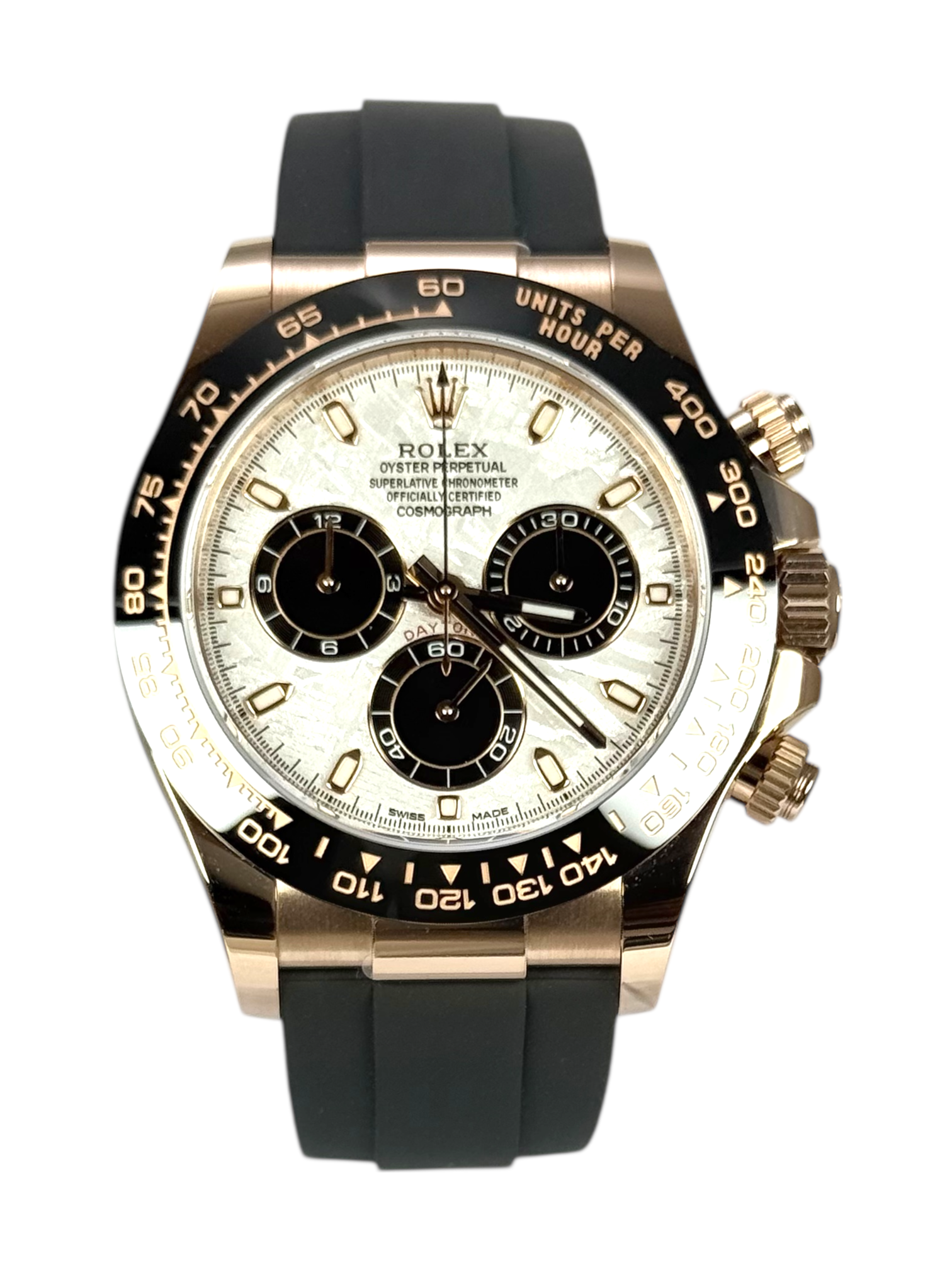 This Rolex Daytona 116515 LN has a meteorite dial and a rubber strap. This Rolex has undergone a thorough inspection of water resistance, accuracy, functionality and condition to determine the level of reconditioning required to meet our strict standards. It has also been referenced against technical documents and manufacturer records where available to ensure authenticity and a clean history. Our watches have a 24-month warranty for your peace of mind, in conjunction with any remaining manufacturer’s warranty from new or from service. To maintain the manufacturer’s warranty on this watch, it has not been polished in our service centre.