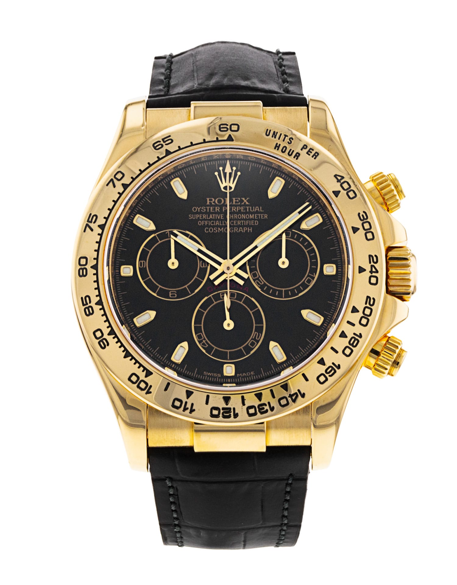 This Rolex Daytona 116518 has a black baton dial and a leather strap. This Rolex has undergone a thorough inspection of water resistance, accuracy, functionality and condition to determine the level of reconditioning required to meet our strict standards. It has also been referenced against technical documents and manufacturer records where available to ensure authenticity and a clean history. All our watches have a 24-month warranty for your peace of mind. One of our skilled polishing technicians has removed marks on the case and bracelet of this watch, brought about by daily wear and tear, which is why this watch does not come with the remaining manufacturer’s warranty.