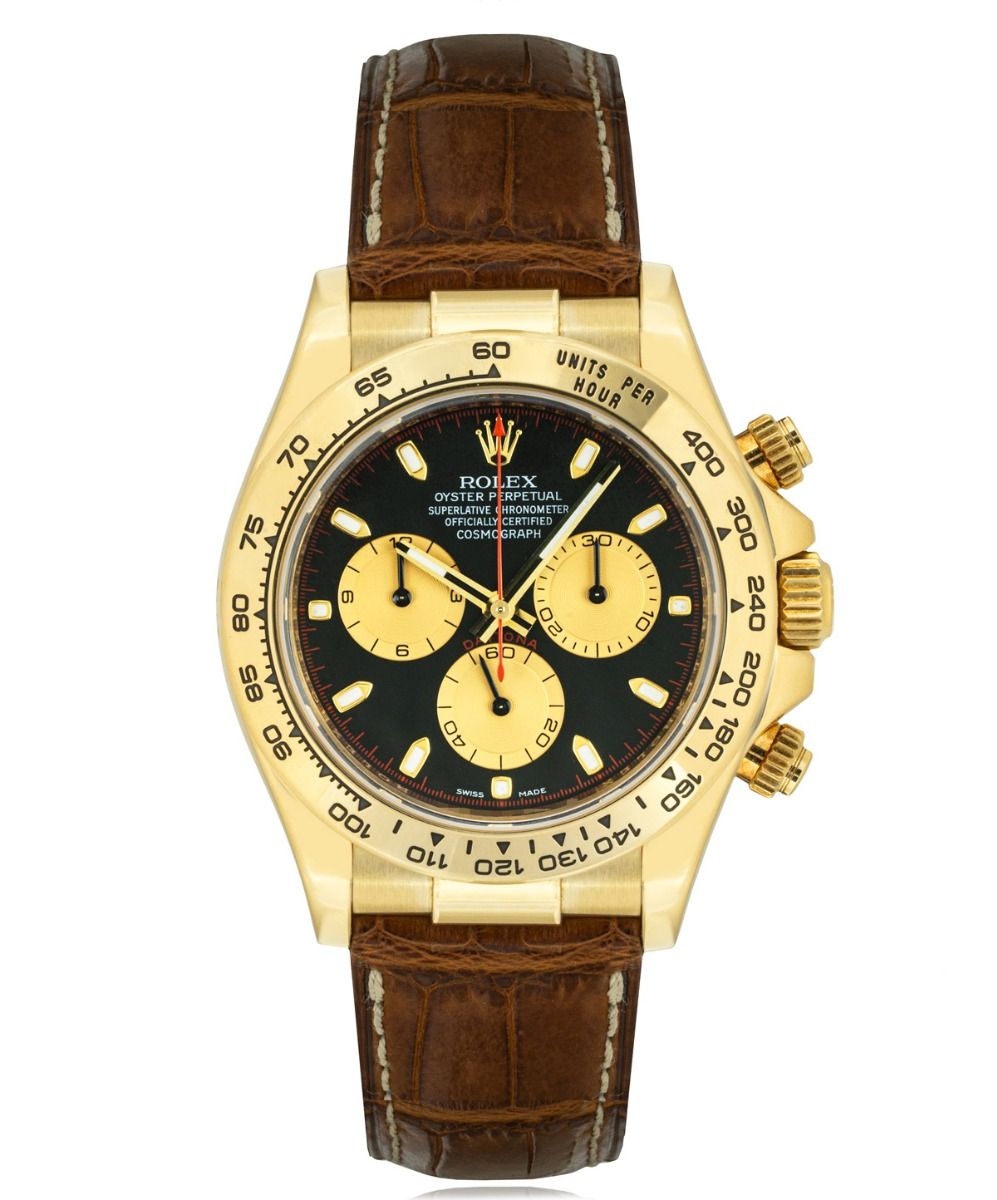 This Rolex Daytona 116518 has a black baton dial and a leather strap. This Rolex has undergone a thorough inspection of water resistance, accuracy, functionality and condition to determine the level of reconditioning required to meet our strict standards. It has also been referenced against technical documents and manufacturer records where available to ensure authenticity and a clean history. All our watches have a 24-month warranty for your peace of mind. One of our skilled polishing technicians has removed marks on the case and bracelet of this watch, brought about by daily wear and tear, which is why this watch does not come with the remaining manufacturer’s warranty.