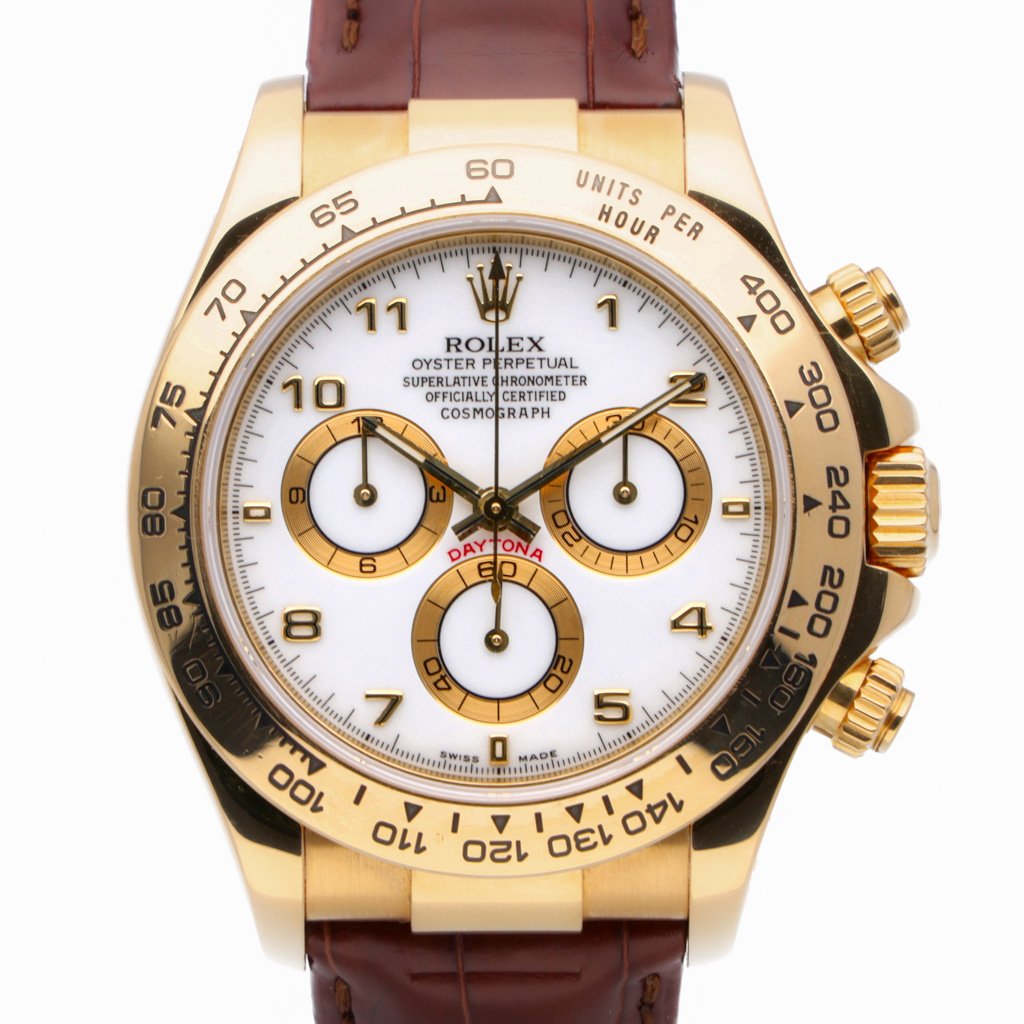 This Rolex Daytona 116518 has a white arabic dial and a leather strap. This Rolex has undergone a thorough inspection of water resistance, accuracy, functionality and condition to determine the level of reconditioning required to meet our strict standards. It has also been referenced against technical documents and manufacturer records where available to ensure authenticity and a clean history. All our watches have a 24-month warranty for your peace of mind. One of our skilled polishing technicians has removed marks on the case and bracelet of this watch, brought about by daily wear and tear, which is why this watch does not come with the remaining manufacturer’s warranty.