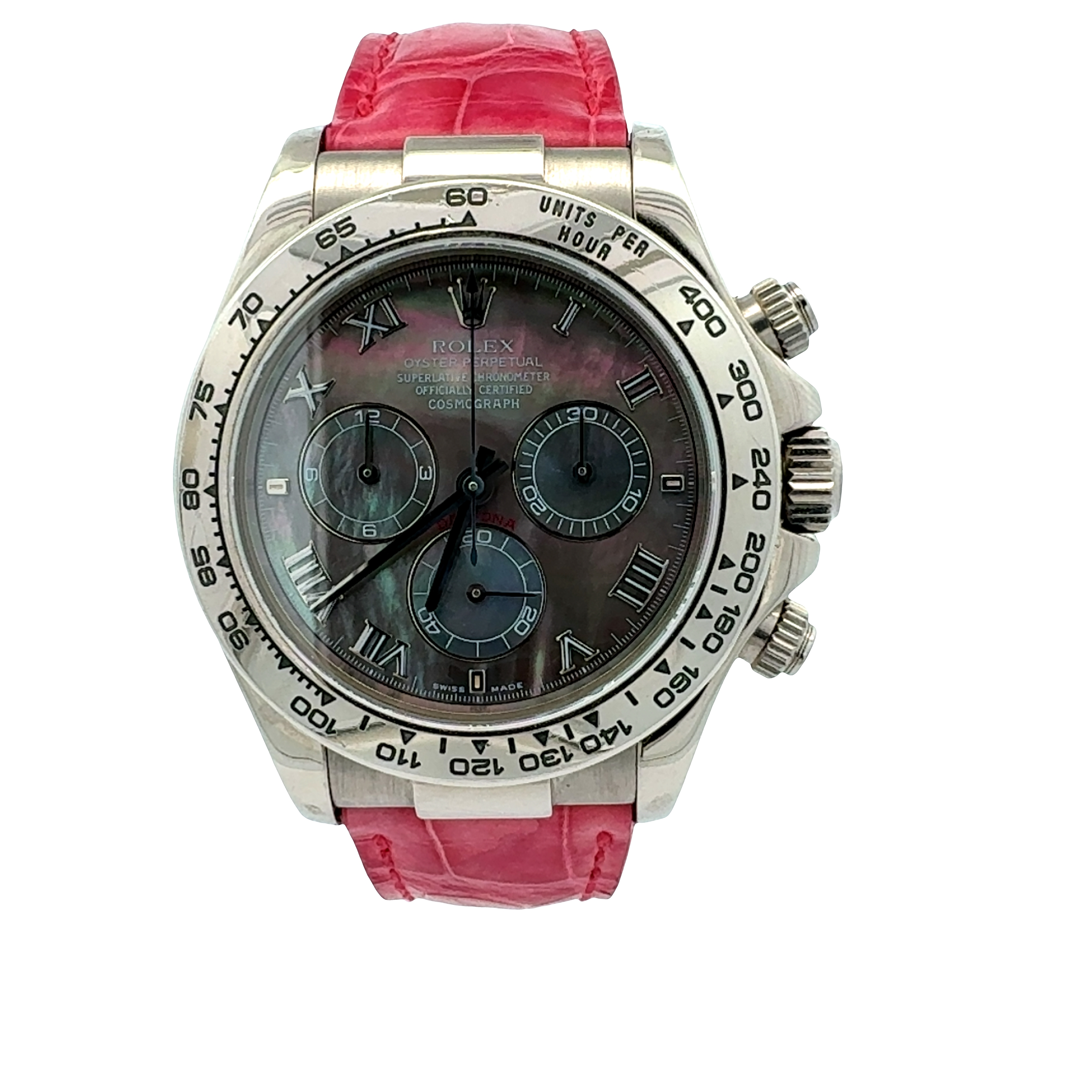 This Rolex Daytona 116519 has a mother of pearl pink roman numeral dial and a leather strap. This Rolex has undergone a thorough inspection of water resistance, accuracy, functionality and condition to determine the level of reconditioning required to meet our strict standards. It has also been referenced against technical documents and manufacturer records where available to ensure authenticity and a clean history. All our watches have a 24-month warranty for your peace of mind. One of our skilled polishing technicians has removed marks on the case and bracelet of this watch, brought about by daily wear and tear, which is why this watch does not come with the remaining manufacturer’s warranty.