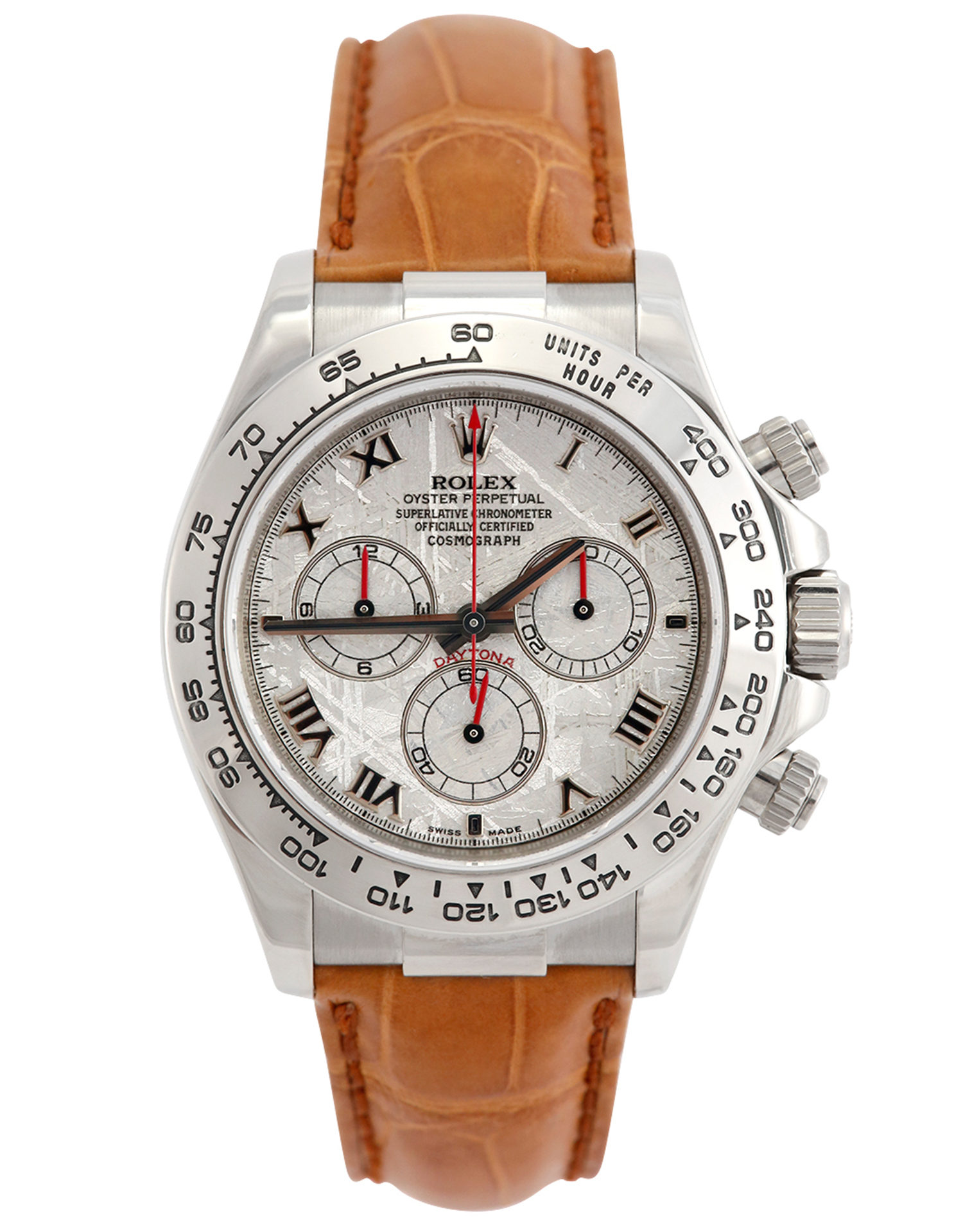 This Rolex Daytona 116519 has a meteorite roman numeral dial and a leather strap. This Rolex has undergone a thorough inspection of water resistance, accuracy, functionality and condition to determine the level of reconditioning required to meet our strict standards. It has also been referenced against technical documents and manufacturer records where available to ensure authenticity and a clean history. All our watches have a 24-month warranty for your peace of mind. One of our skilled polishing technicians has removed marks on the case and bracelet of this watch, brought about by daily wear and tear, which is why this watch does not come with the remaining manufacturer’s warranty.