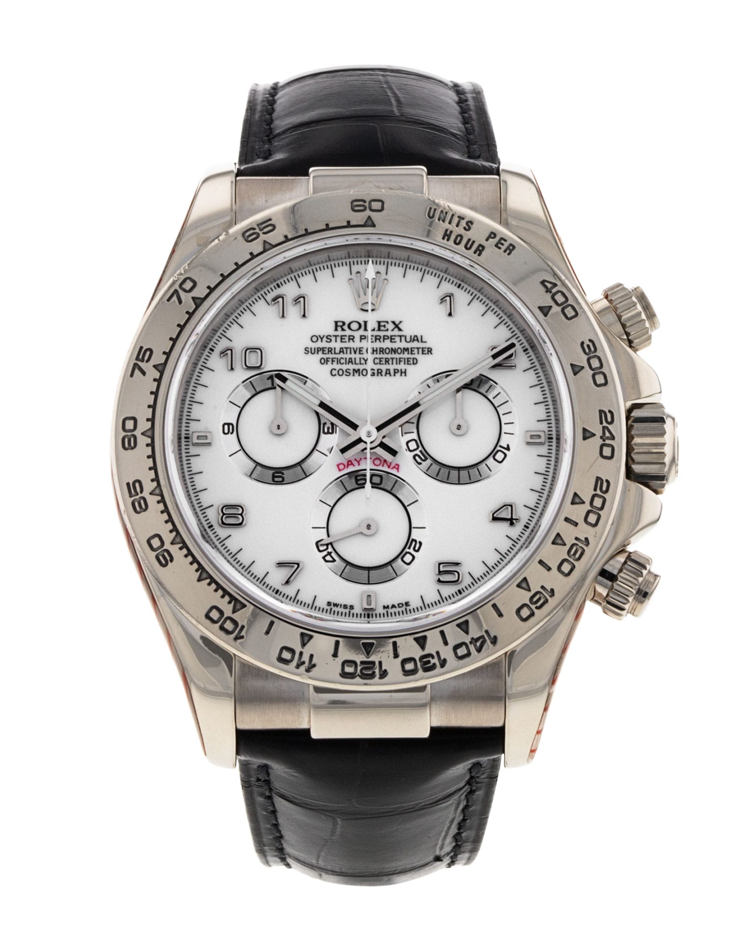 This Rolex Daytona 116519 has a white arabic dial and a leather strap. This Rolex has undergone a thorough inspection of water resistance, accuracy, functionality and condition to determine the level of reconditioning required to meet our strict standards. It has also been referenced against technical documents and manufacturer records where available to ensure authenticity and a clean history. All our watches have a 24-month warranty for your peace of mind. One of our skilled polishing technicians has removed marks on the case and bracelet of this watch, brought about by daily wear and tear, which is why this watch does not come with the remaining manufacturer’s warranty.