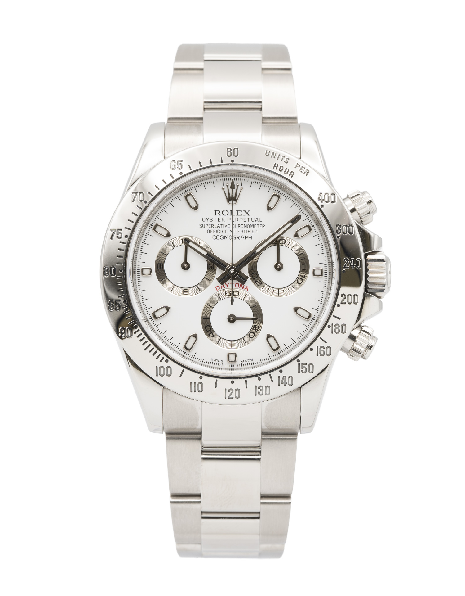 This Rolex Daytona 116520 - APH Dial has a white dial and a bracelet strap. This Rolex has undergone a thorough inspection of water resistance, accuracy, functionality and condition to determine the level of reconditioning required to meet our strict standards. It has also been referenced against technical documents and manufacturer records where available to ensure authenticity and a clean history. All our watches have a 24-month warranty for your peace of mind. One of our skilled polishing technicians has removed marks on the case and bracelet of this watch, brought about by daily wear and tear, which is why this watch does not come with the remaining manufacturer’s warranty.