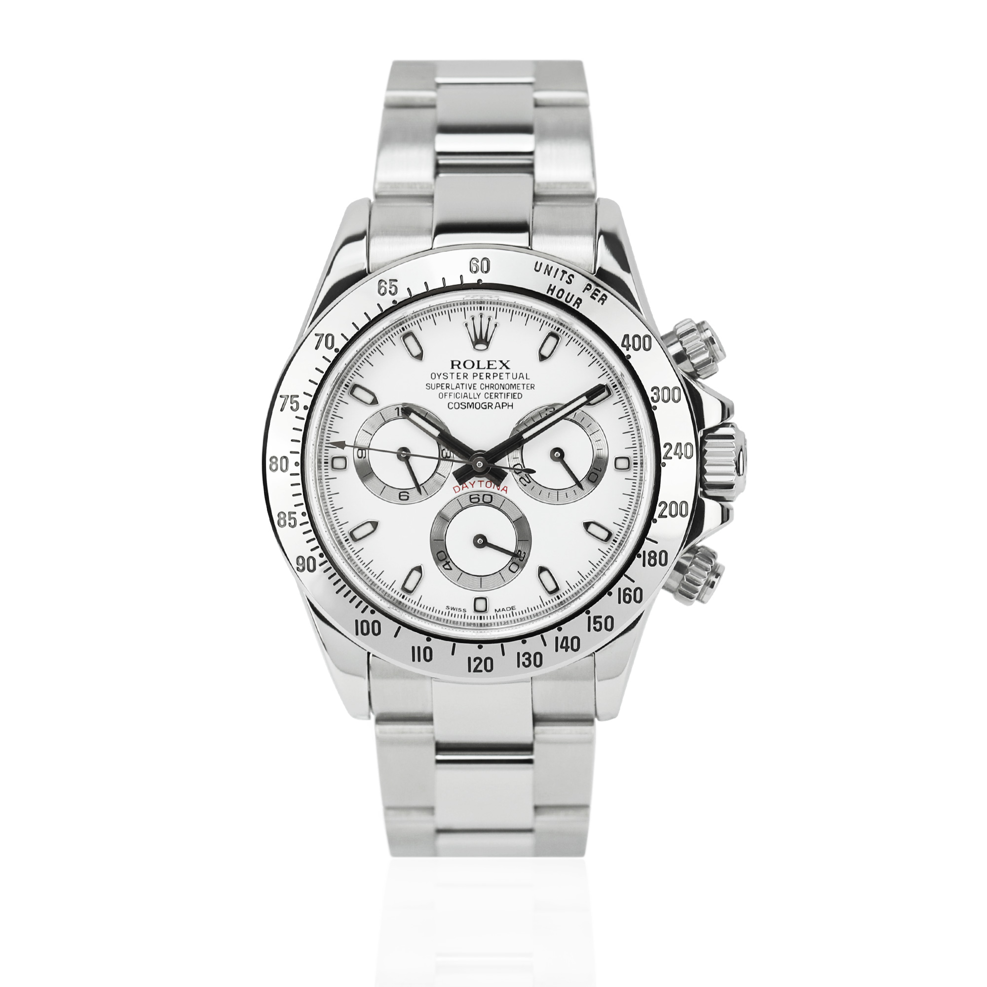 This Rolex Daytona 116520 - APH Dial has a white dial and a bracelet strap. This Rolex has undergone a thorough inspection of water resistance, accuracy, functionality and condition to determine the level of reconditioning required to meet our strict standards. It has also been referenced against technical documents and manufacturer records where available to ensure authenticity and a clean history. All our watches have a 24-month warranty for your peace of mind. One of our skilled polishing technicians has removed marks on the case and bracelet of this watch, brought about by daily wear and tear, which is why this watch does not come with the remaining manufacturer’s warranty.