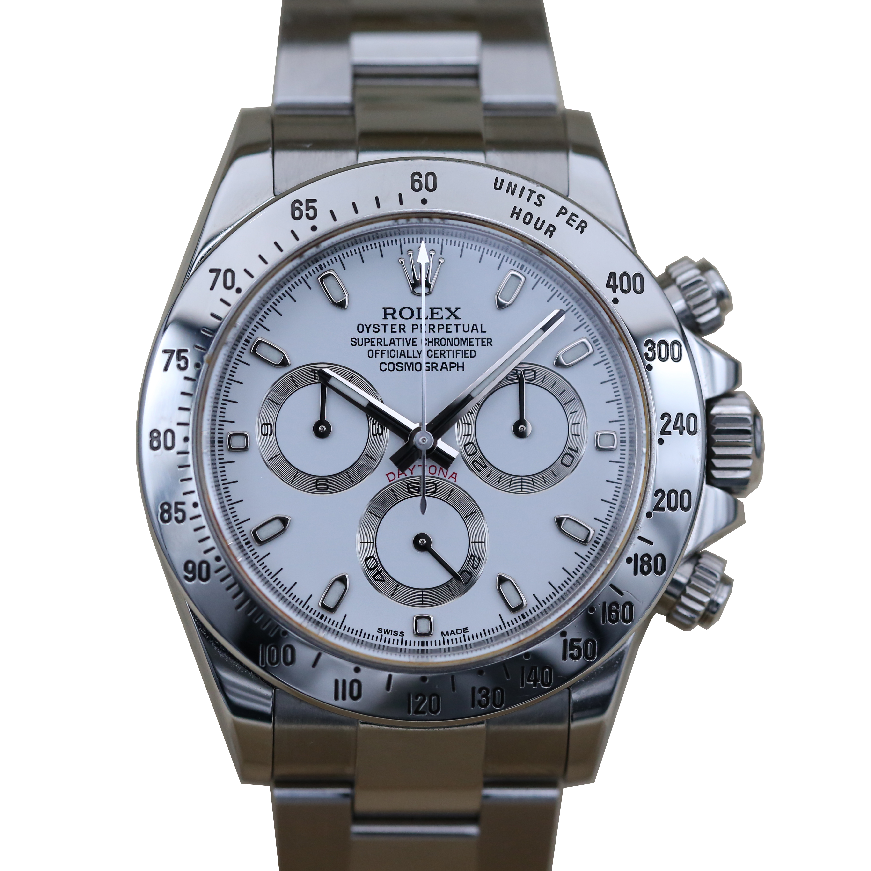 This Rolex Daytona 116520 - APH Dial has a white dial and a bracelet strap. This Rolex has undergone a thorough inspection of water resistance, accuracy, functionality and condition to determine the level of reconditioning required to meet our strict standards. It has also been referenced against technical documents and manufacturer records where available to ensure authenticity and a clean history. All our watches have a 24-month warranty for your peace of mind. One of our skilled polishing technicians has removed marks on the case and bracelet of this watch, brought about by daily wear and tear, which is why this watch does not come with the remaining manufacturer’s warranty.