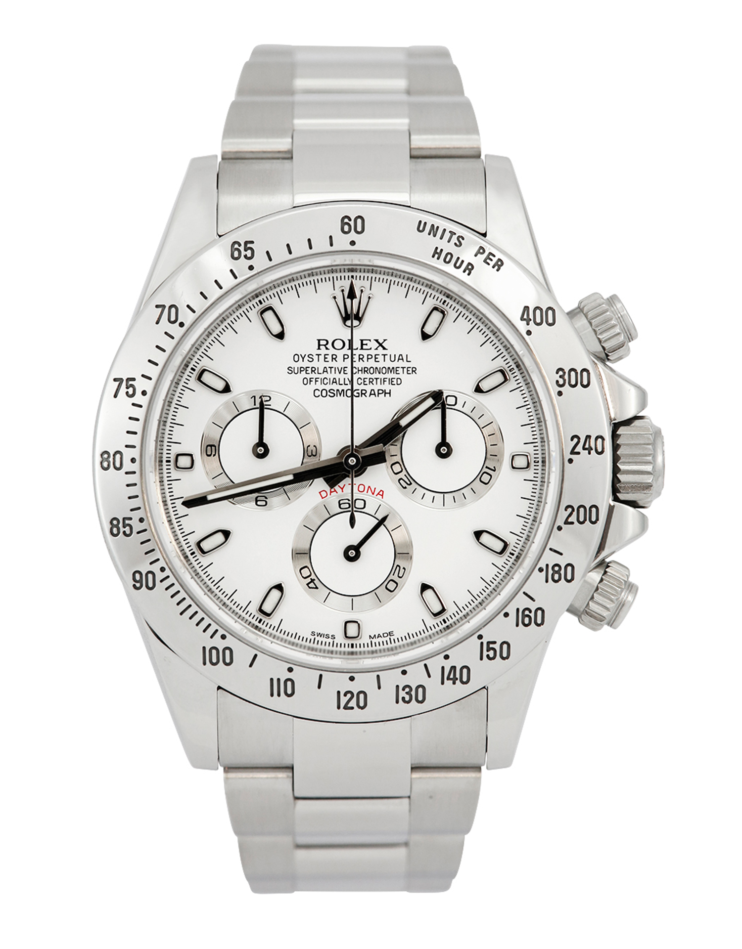 This Rolex Daytona 116520 - APH Dial has a white dial and a bracelet strap. This Rolex has undergone a thorough inspection of water resistance, accuracy, functionality and condition to determine the level of reconditioning required to meet our strict standards. It has also been referenced against technical documents and manufacturer records where available to ensure authenticity and a clean history. Our watches have a 24-month warranty for your peace of mind, in conjunction with any remaining manufacturer’s warranty from new or from service. To maintain the manufacturer’s warranty on this watch, it has not been polished in our service centre.